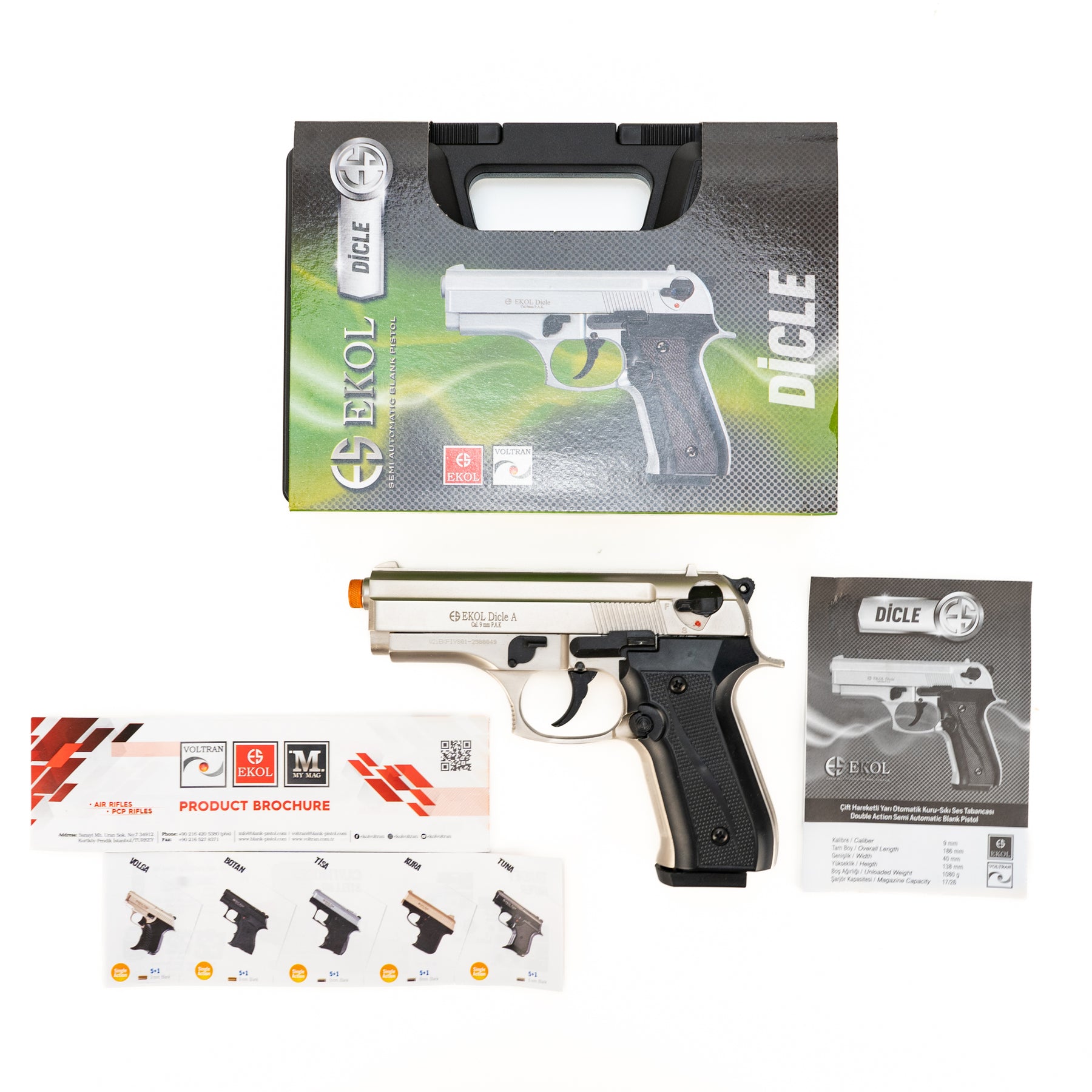 EKOL Dicle 8000 Semi-Automatic Satin Finish Front Venting Blank Firing Pistol chambered in 9mm PAK. Brand new with original case, manual and brochures.
