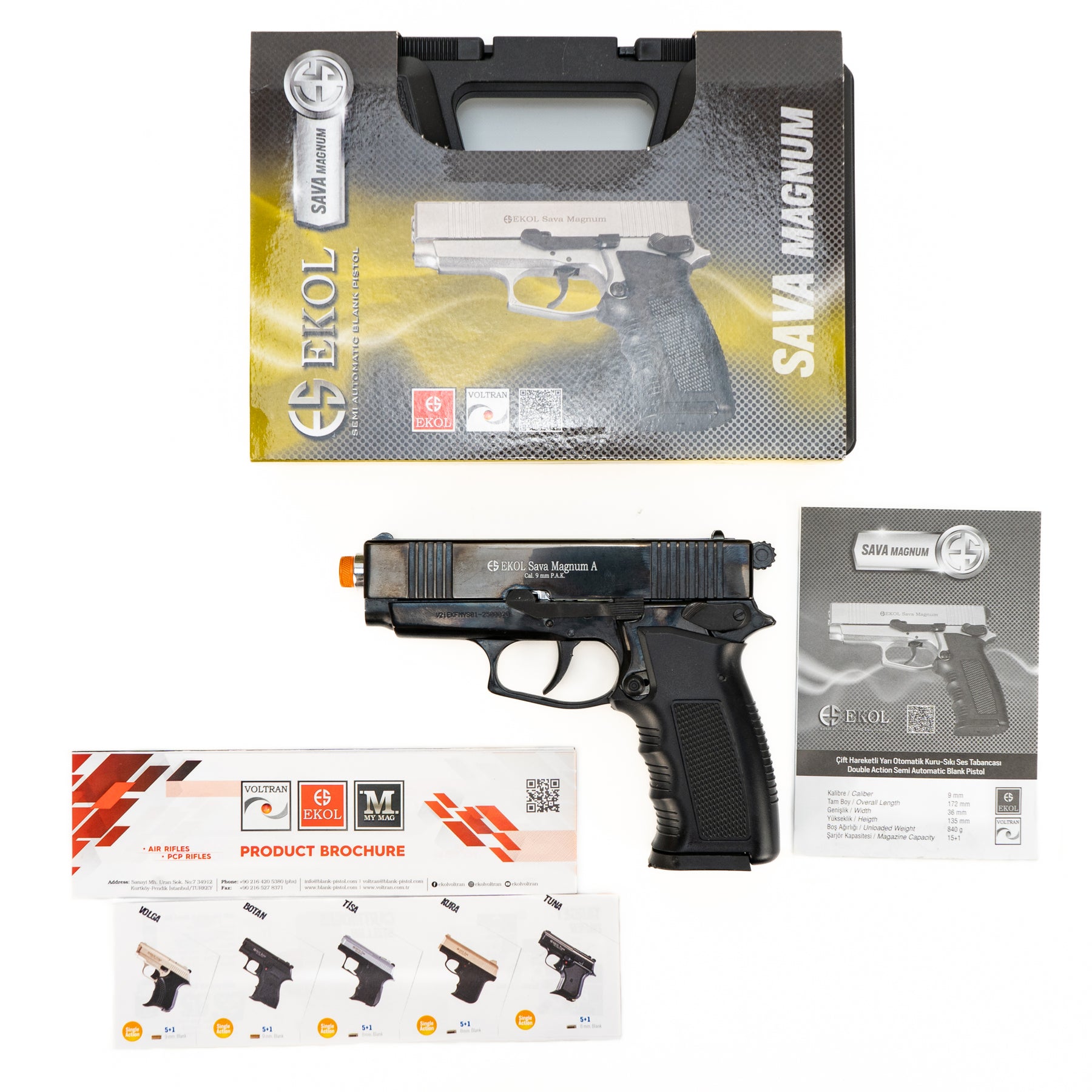 EKOL Sava Magnum Semi-Automatic Front Venting Black Blank Firing Pistol chambered in 9mm PAK. Brand new in box with original case, manual & brochures.