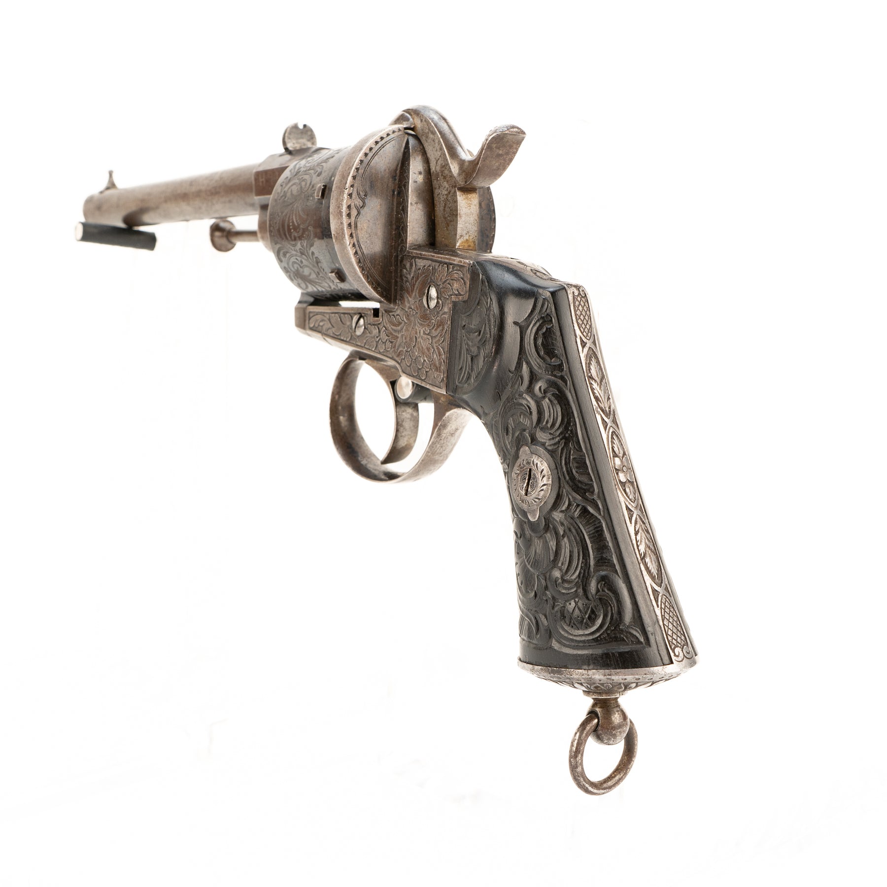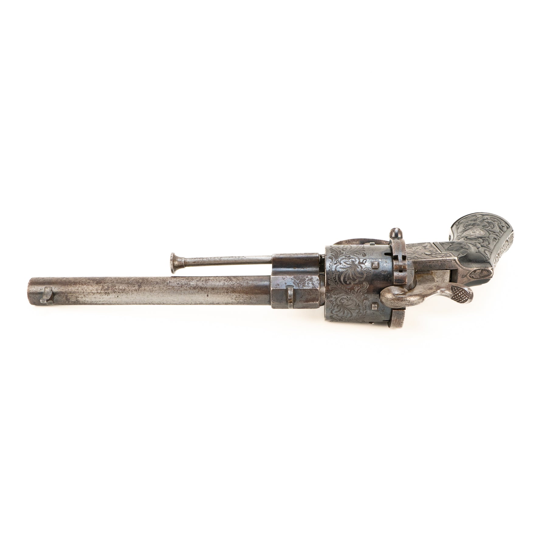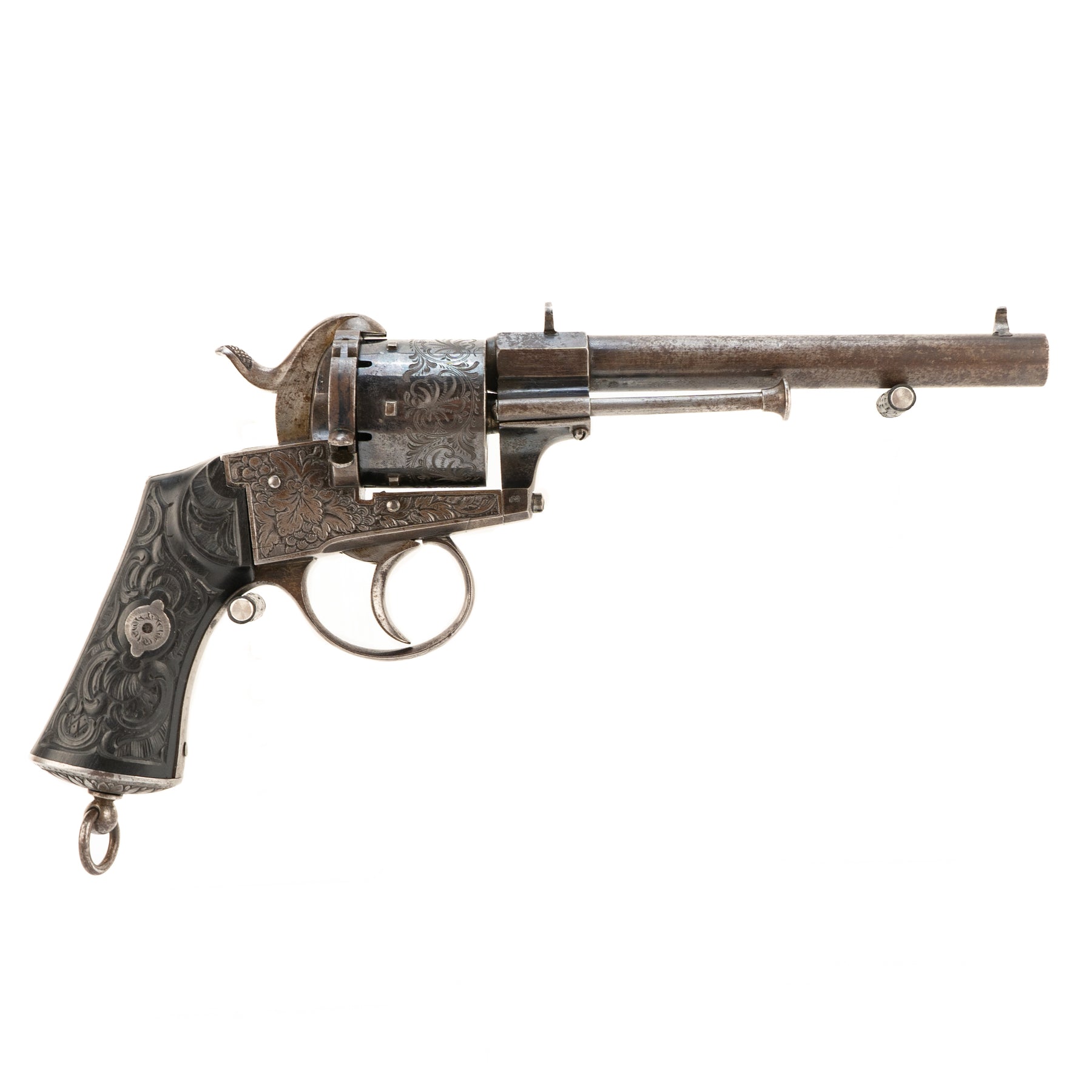 A beautiful and intricately engraved large frame Lefaucheaux style Belgian 12mm pinfire revolver.