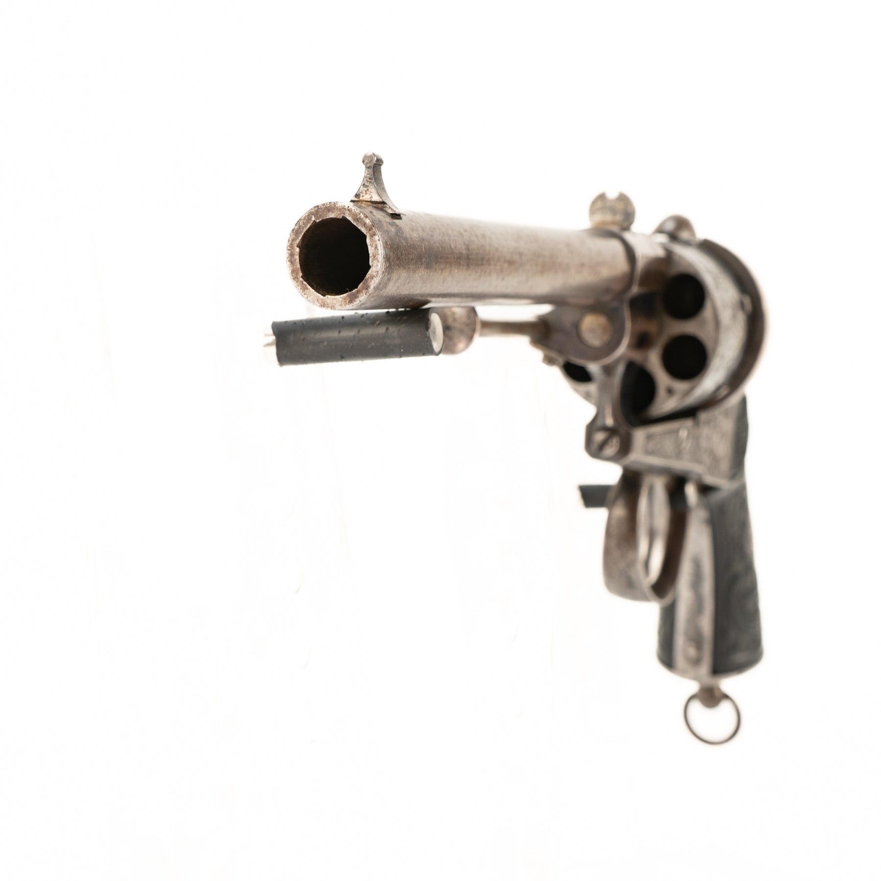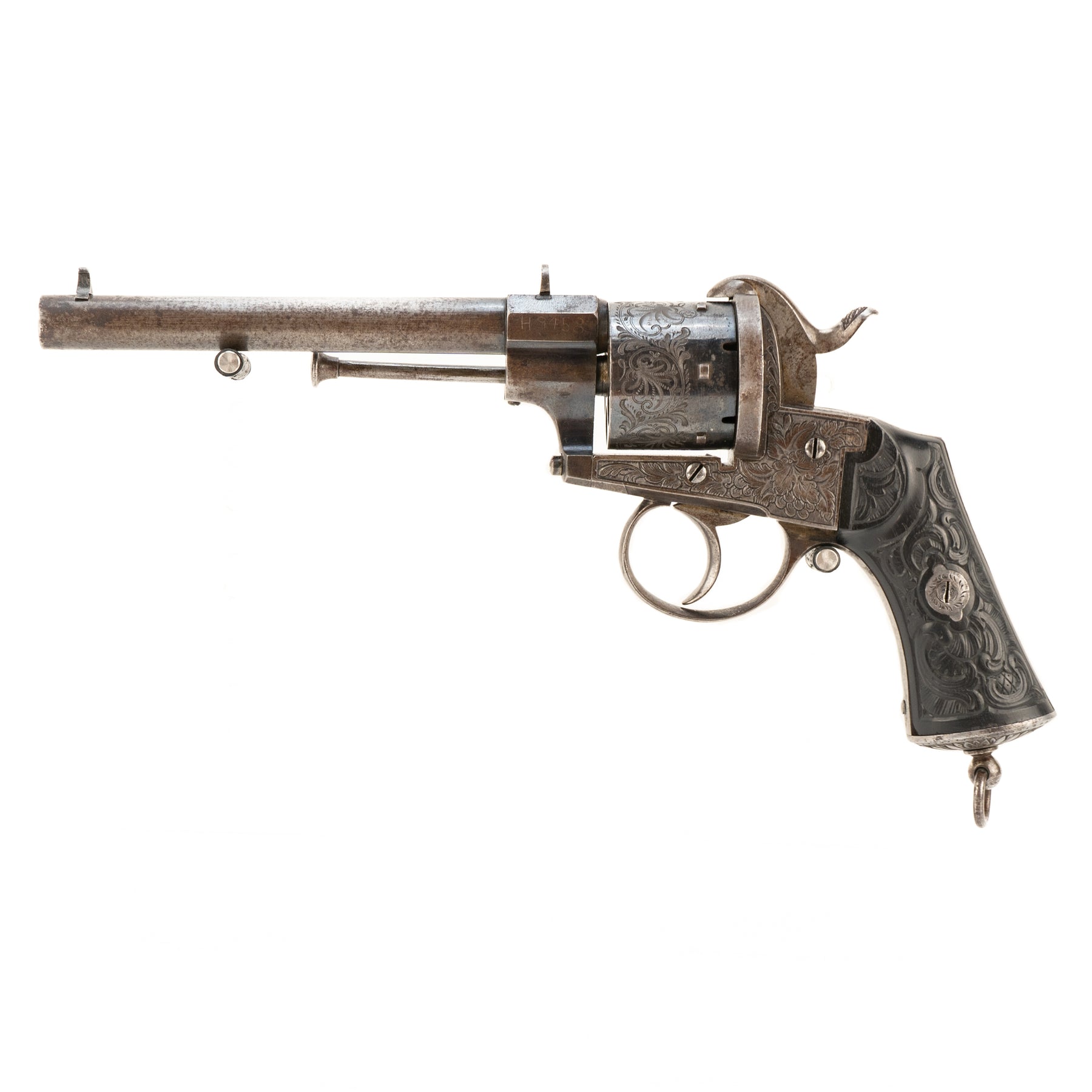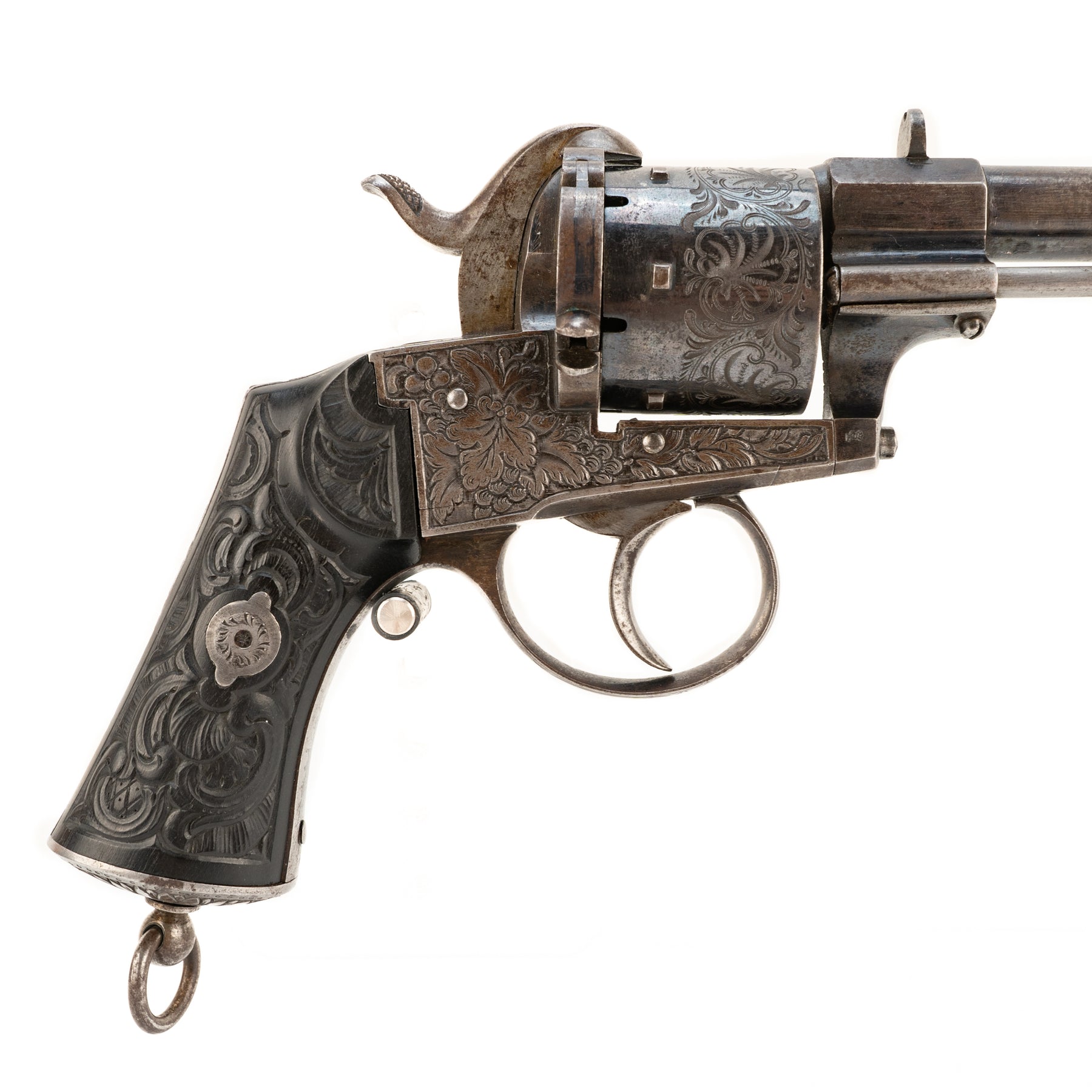 A beautiful and intricately engraved large frame Lefaucheaux style Belgian 12mm pinfire revolver.