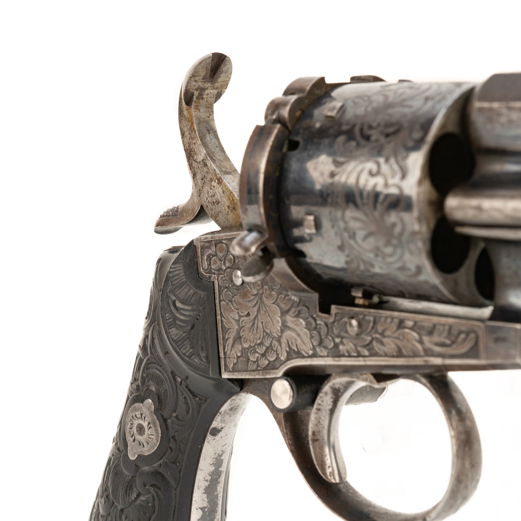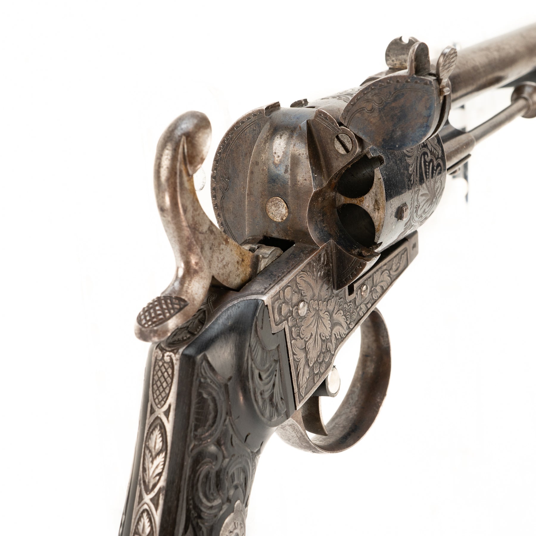 Bore is clean with strong rifling. Action is smooth and crisp and the hammer holds and both half and full cock. Lovely carved grips accented by an engraved back strap and pommel. Frame is deeply engraved with ornate grapevine, and the cylinder is also engraved with a scrolling foliate pattern. Loading gate holds shut with a clever little latch system, and the sliding rod below the barrel is used to eject spent cartridges.