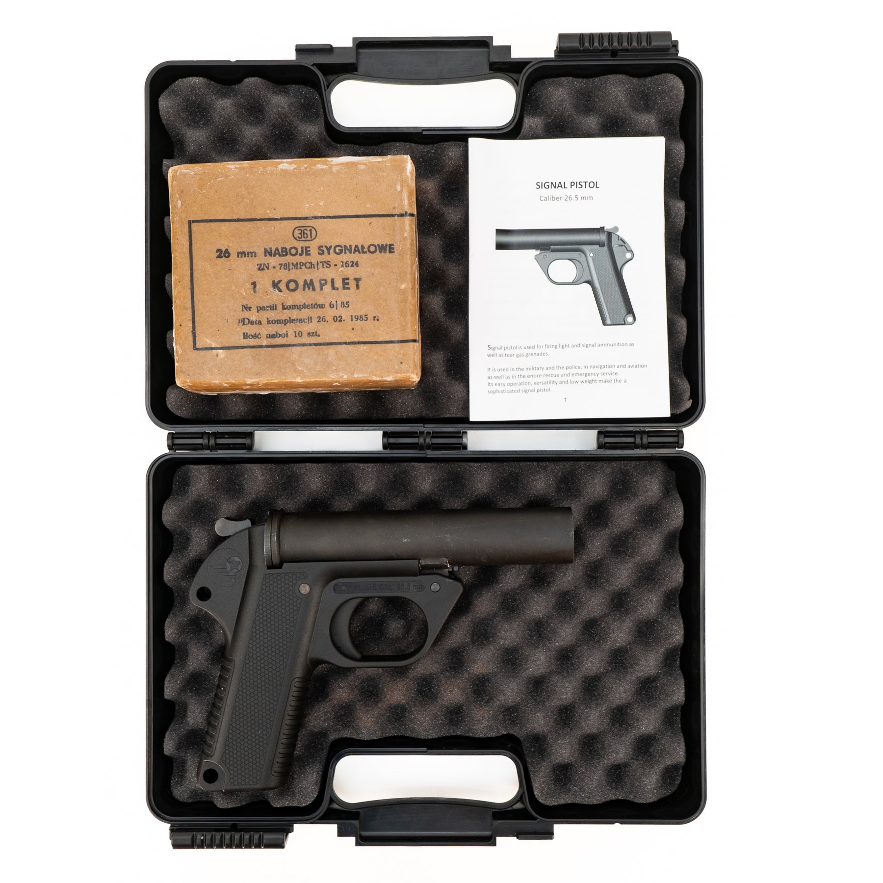 Ikon 26.5mm Signal Flare Gun with wax sealed Polish Military Smoke & Signal Flares. In its original carry case with manual. Wax sealed carton holds 5 smoke and 5 illumination/signal flares.