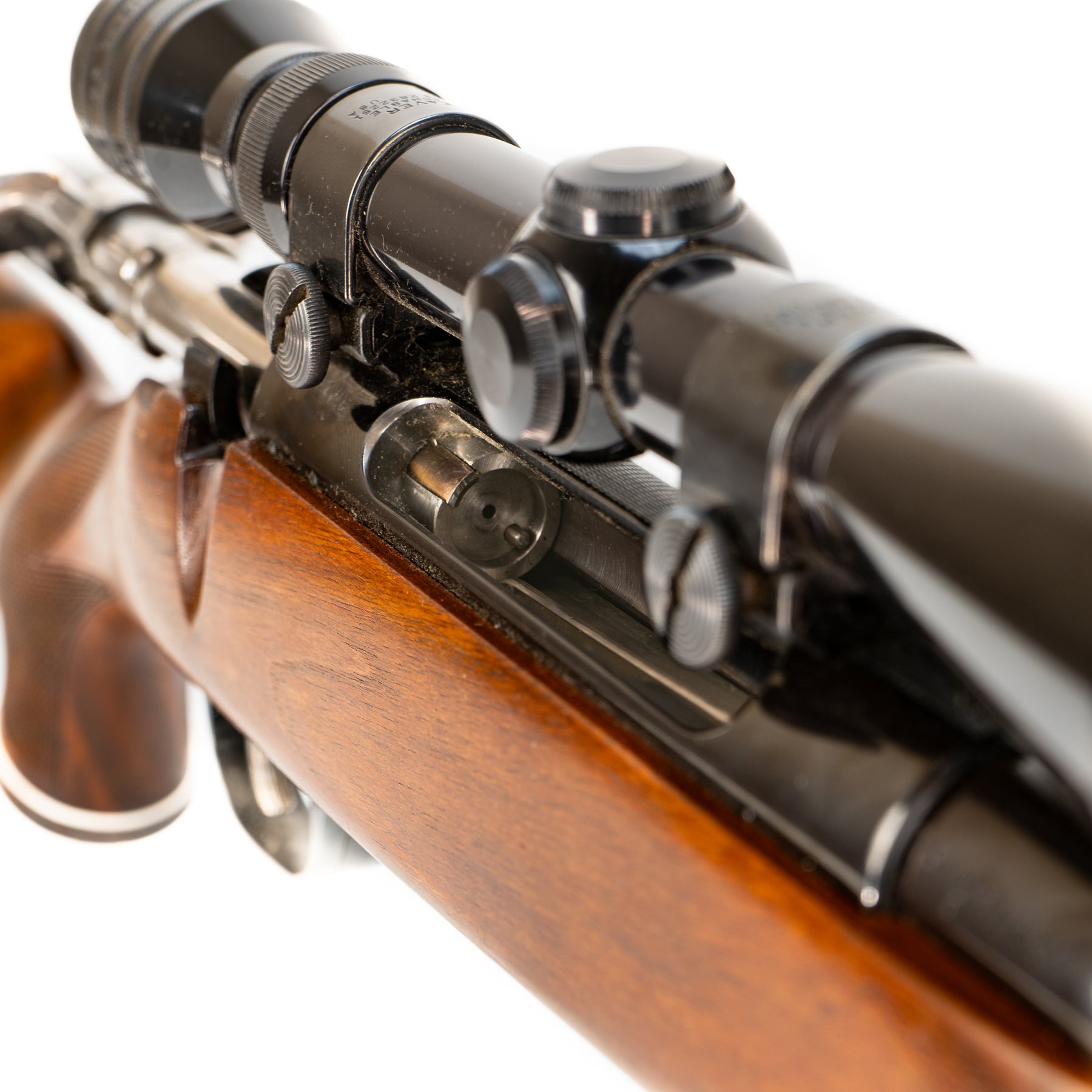 Bore is bright and clean with strong rifling. Action is smooth and crisp. Cosmetically this is in BEAUTIFUL condition with a checkered pistol grip, two tone wood stock with lovely white accents, and a nice thick recoil pad on the butt. Equipped with a Redfield 1" Tube Scope mounted in a Weaver bracket and Ka-Ram-Ba elastic lens caps.