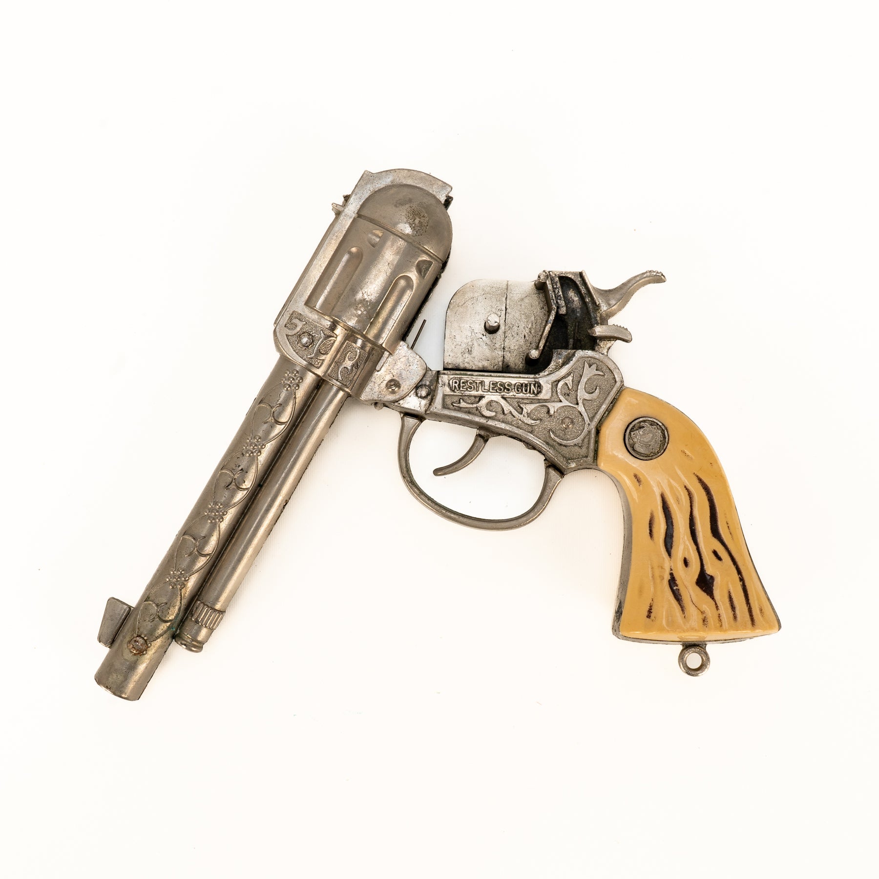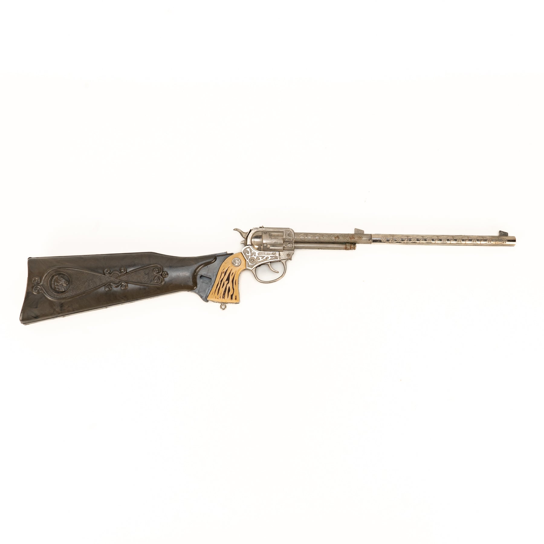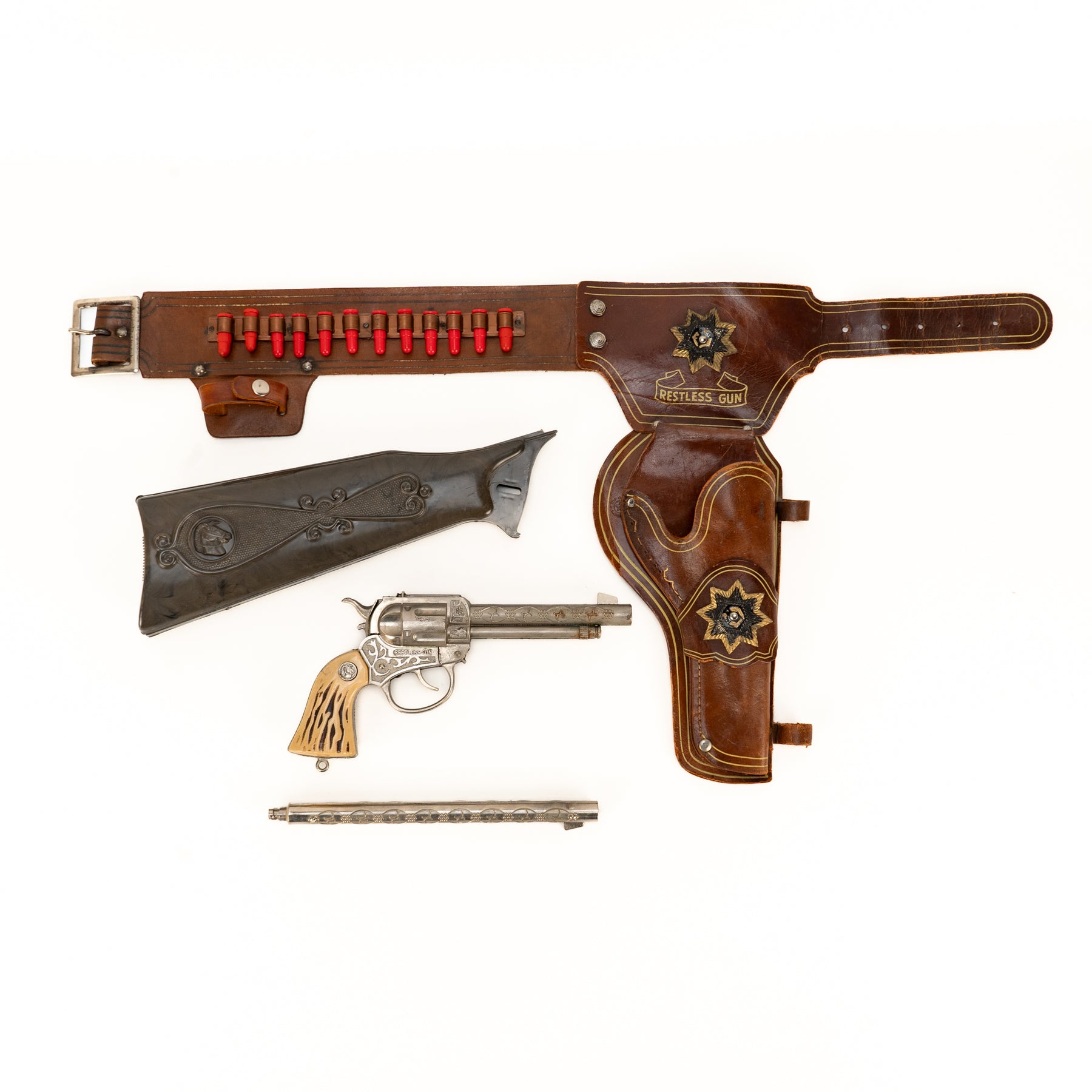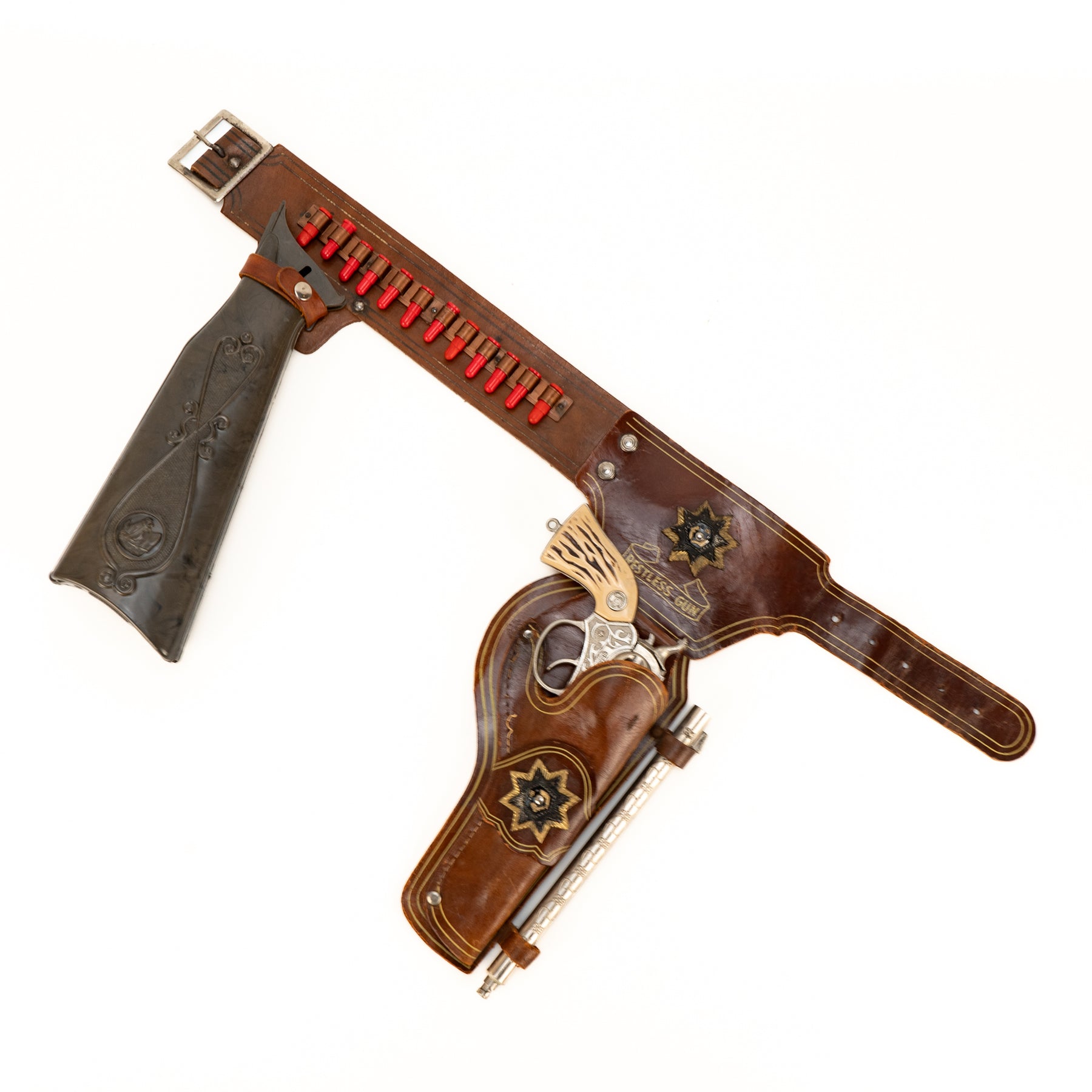 The fantastic and rare Actoy Restless Gun 4 in 1 Rifle Gun with the barrel extension, stock, & original leather holster. The cap gun is in good working order, although I can't for the life of me figure out how the stock is supposed to attach to the back. For the photos it is JUST sitting touching the back, it is NOT fully attached. ONE of the red bullets is missing. Yes, I know it was there in the photo but when I went to post this to the website it had mysteriously vanished. Fingers crossed it turns up having rolled under something inconvenient.