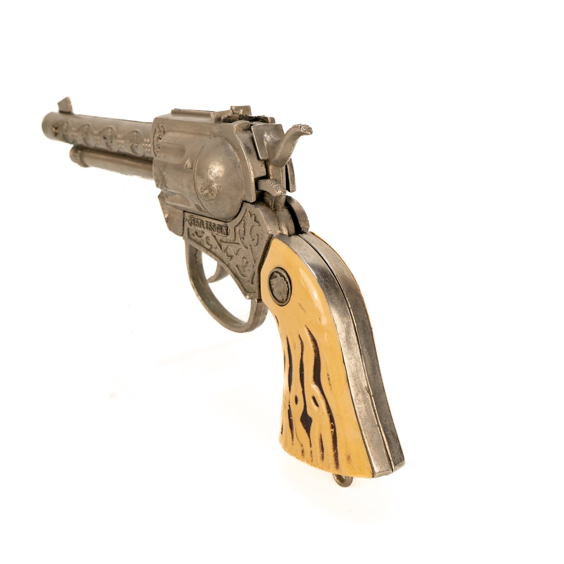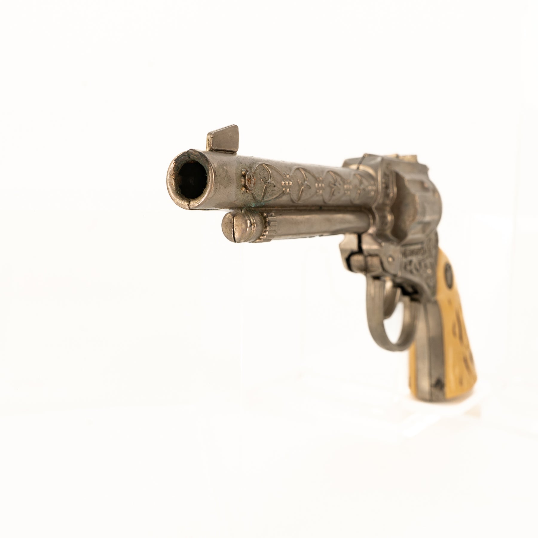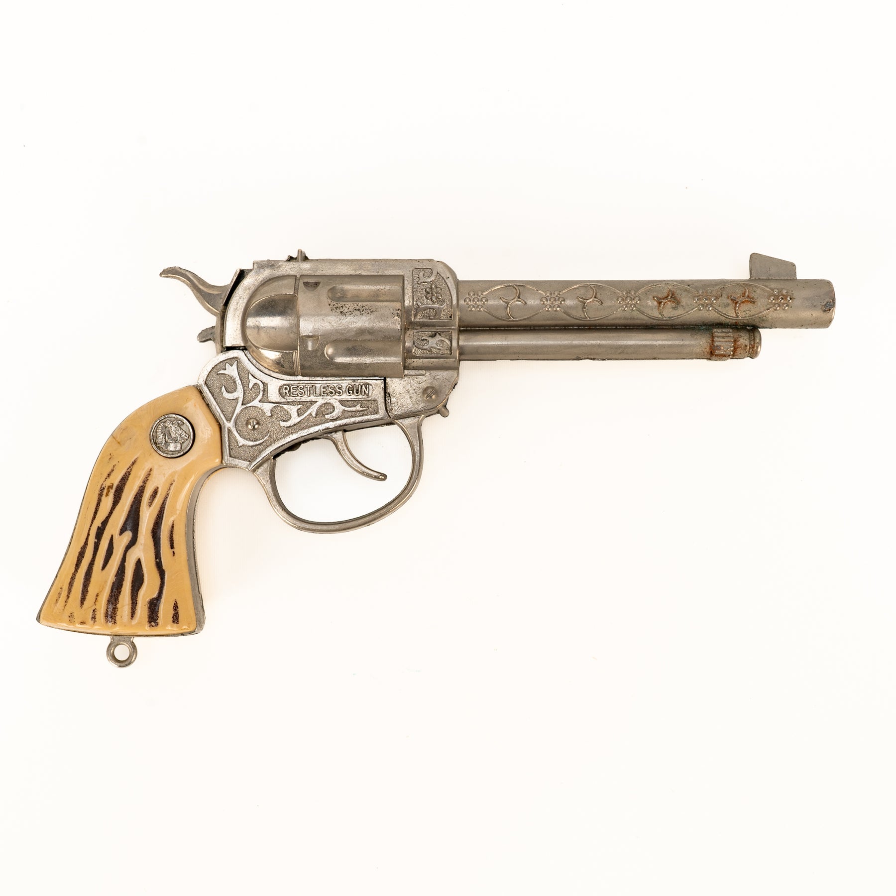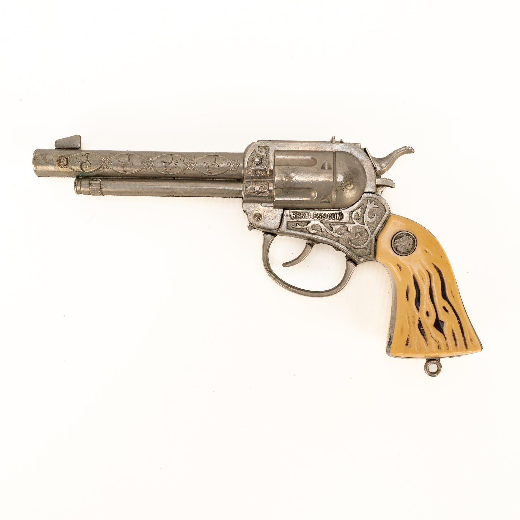 The fantastic and rare Actoy Restless Gun 4 in 1 Rifle Gun with the barrel extension, stock, & original leather holster. The cap gun is in good working order, although I can't for the life of me figure out how the stock is supposed to attach to the back. For the photos it is JUST sitting touching the back, it is NOT fully attached. ONE of the red bullets is missing. Yes, I know it was there in the photo but when I went to post this to the website it had mysteriously vanished. Fingers crossed it turns up having rolled under something inconvenient.