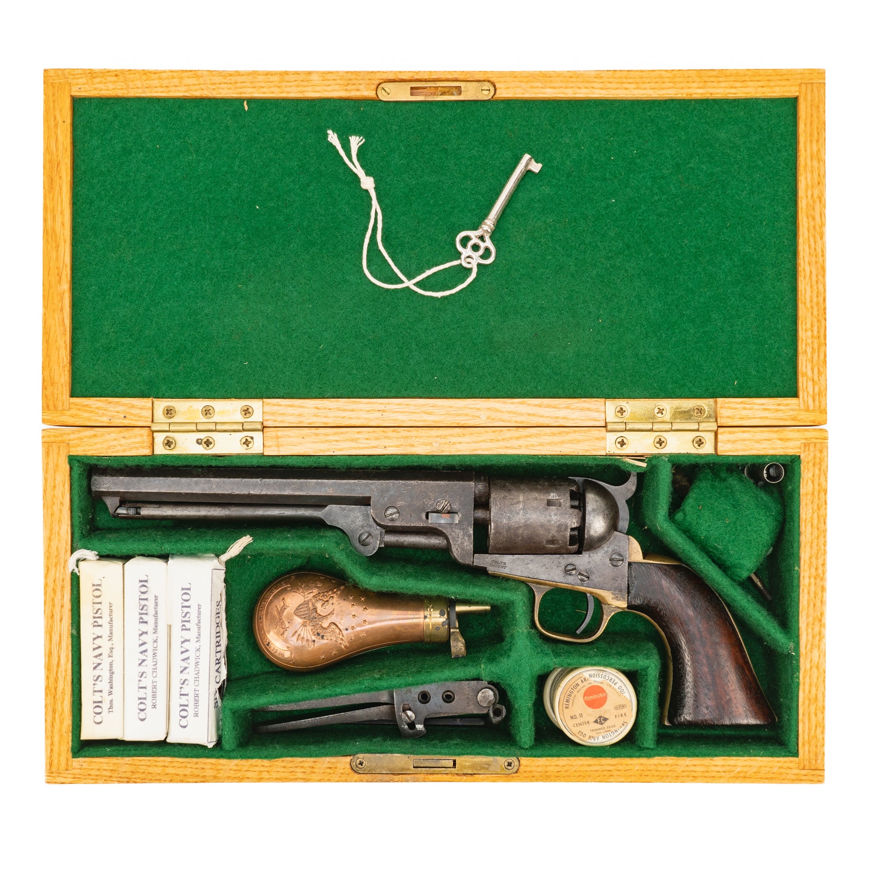 Someone did a phenomenal job putting together this cased Fourth Model Colt 1851 Navy Black Powder Percussion Revolver. Chambered in .36 Cal the most impressive inclusion has to be the original Colt's Patent double mold with one chamber for a bullet, and one for round ball. Along with that is three period correct paper wrapped cartons each containing six paper wrapped pyrodex cartridges (made in April 1996), a small replica powder horn, a nipple wrench/screwdriver tool, two tins of No. 11 percussion caps, a cleaning brush, a small felt bag with patch cloth, and a little casing with a replacement part and a couple of small nails they were likely using as nipple picks.