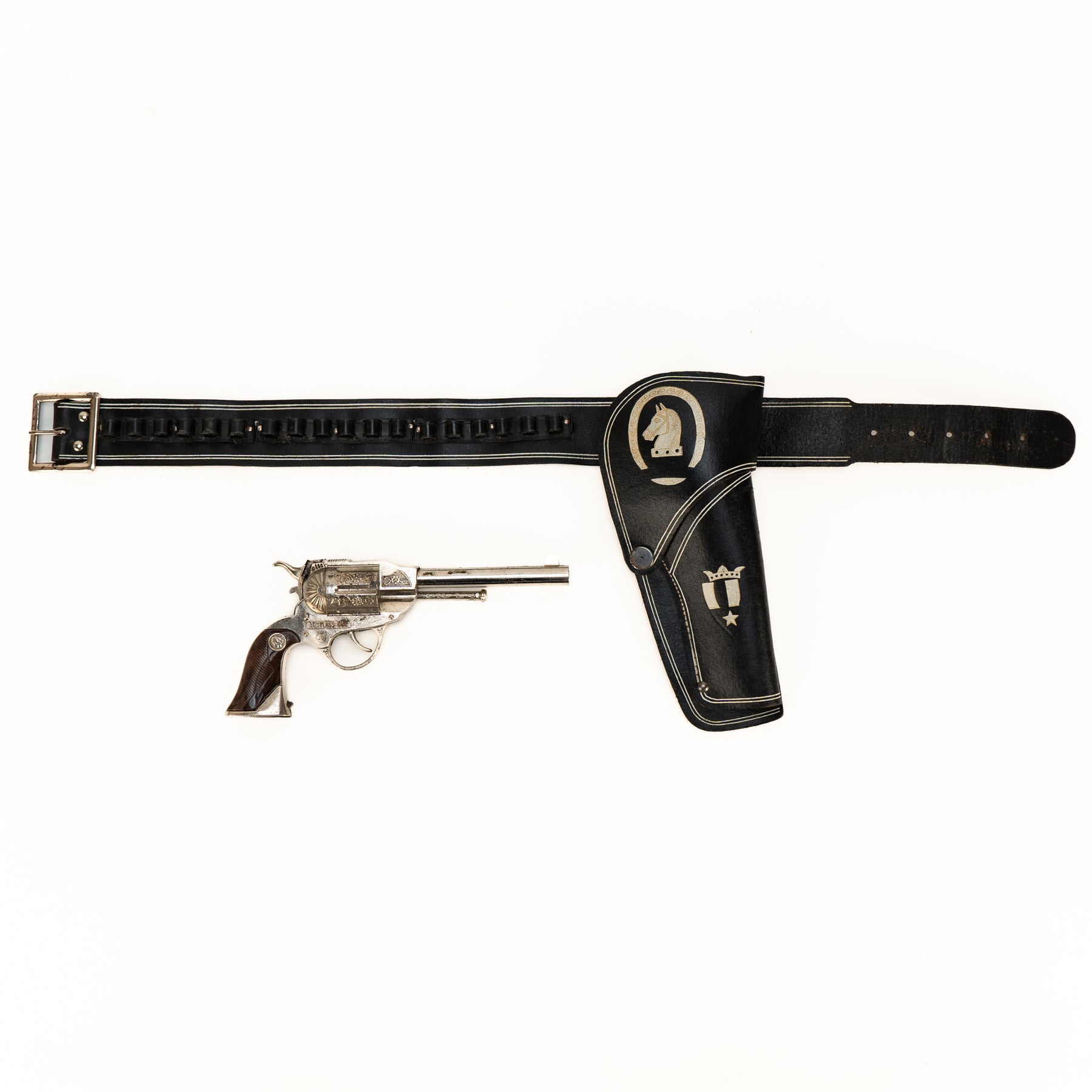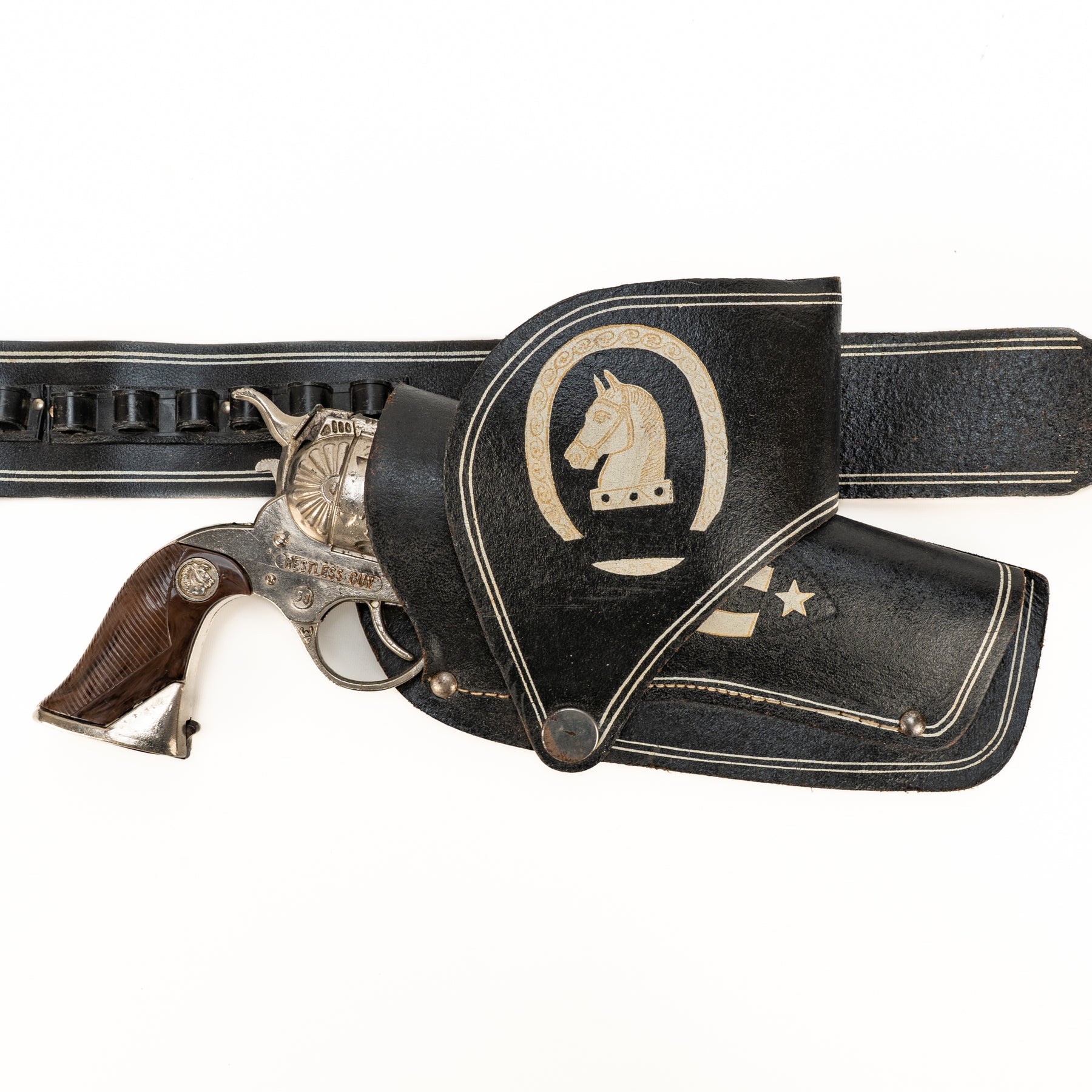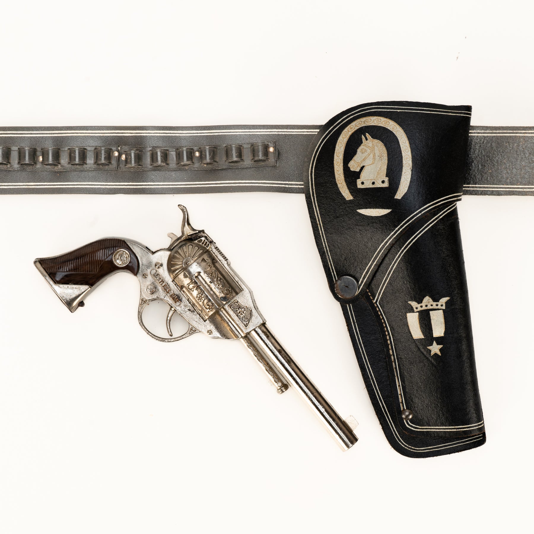 An Esquire Actoy Restless Gun .38 cap gun with a leather quick draw swivel holster. The cap gun is in good working order, with some minor handling wear. The holster is in good used condition, however one of the bullet holders is split and coming away from the belt. Please enlarge and examine all photos to see condition!