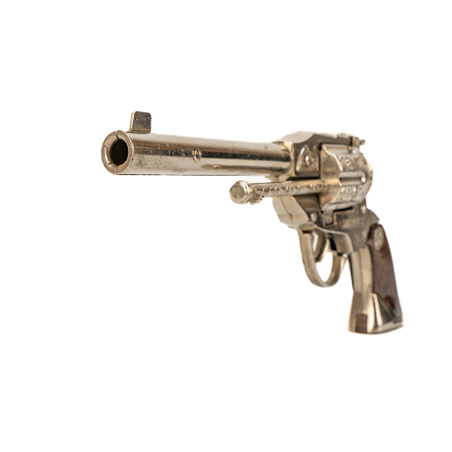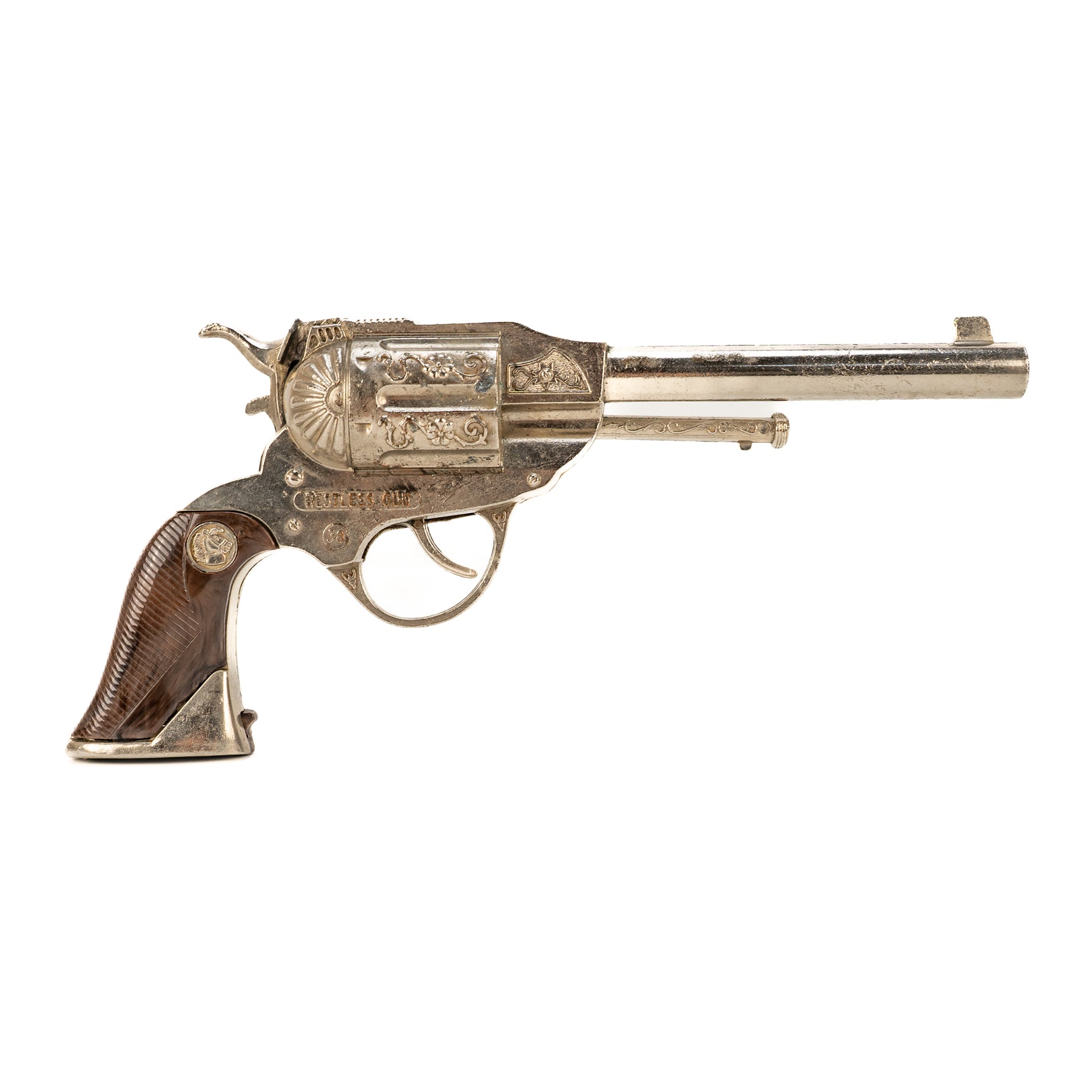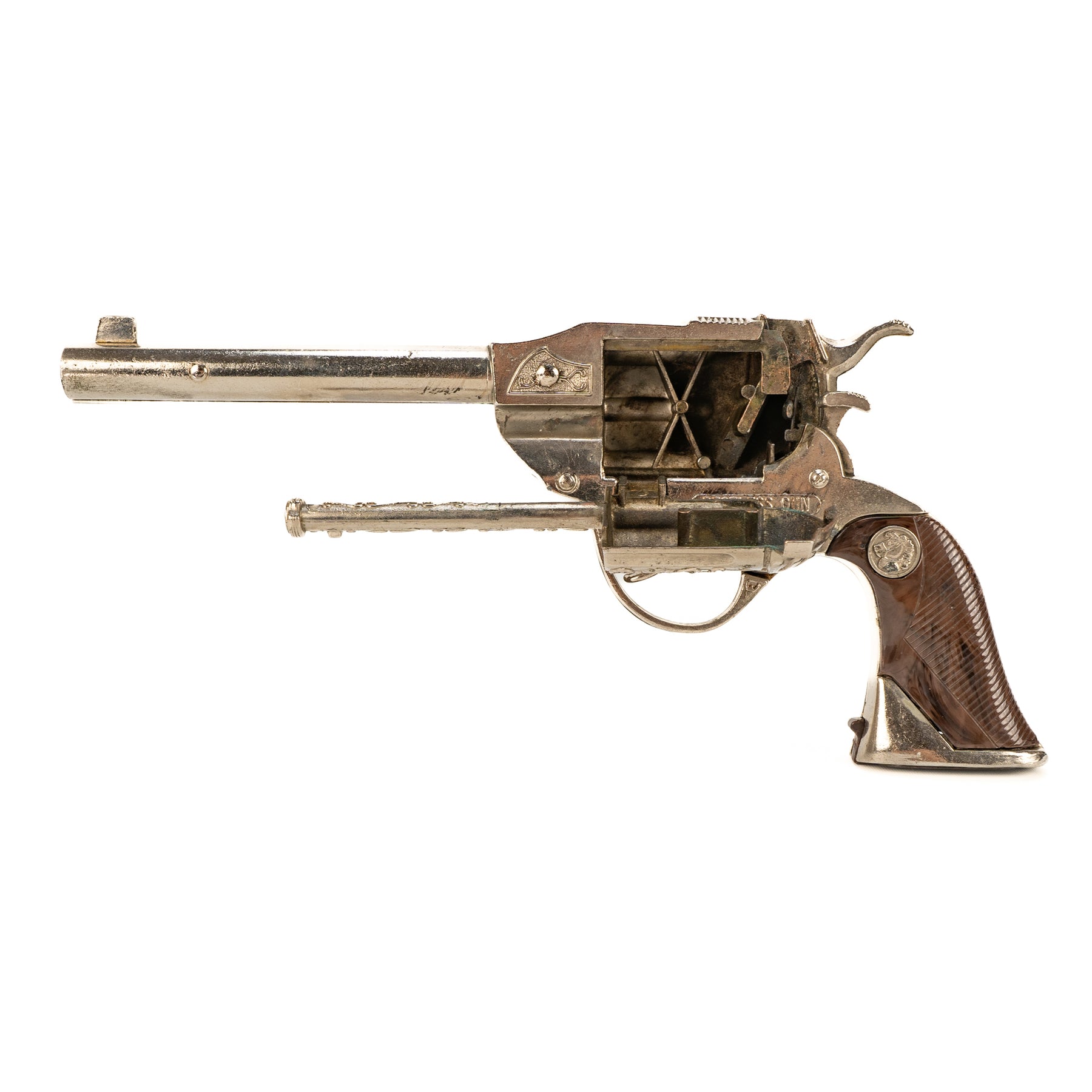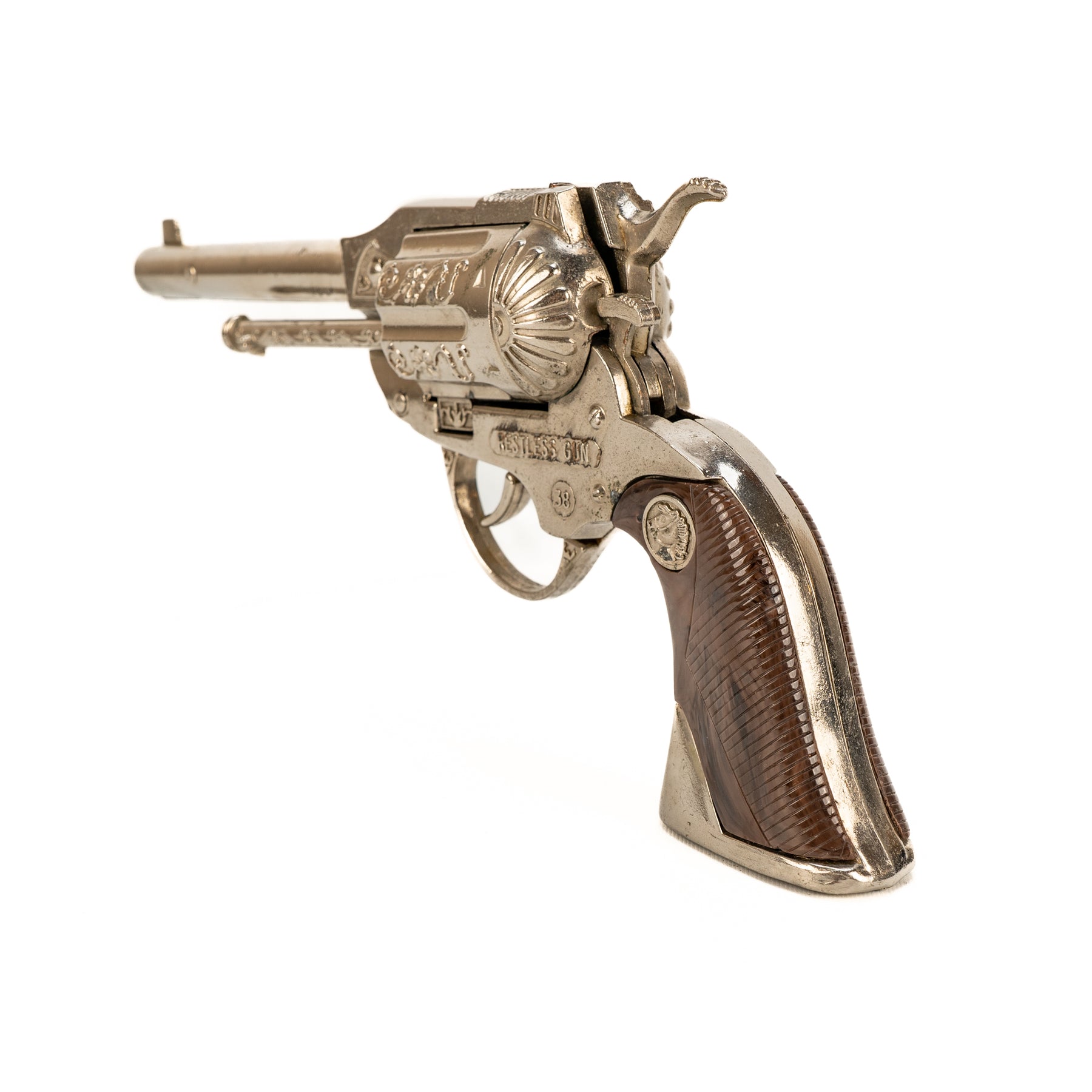An Esquire Actoy Restless Gun .38 cap gun with a leather quick draw swivel holster. The cap gun is in good working order, with some minor handling wear. The holster is in good used condition, however one of the bullet holders is split and coming away from the belt. Please enlarge and examine all photos to see condition!