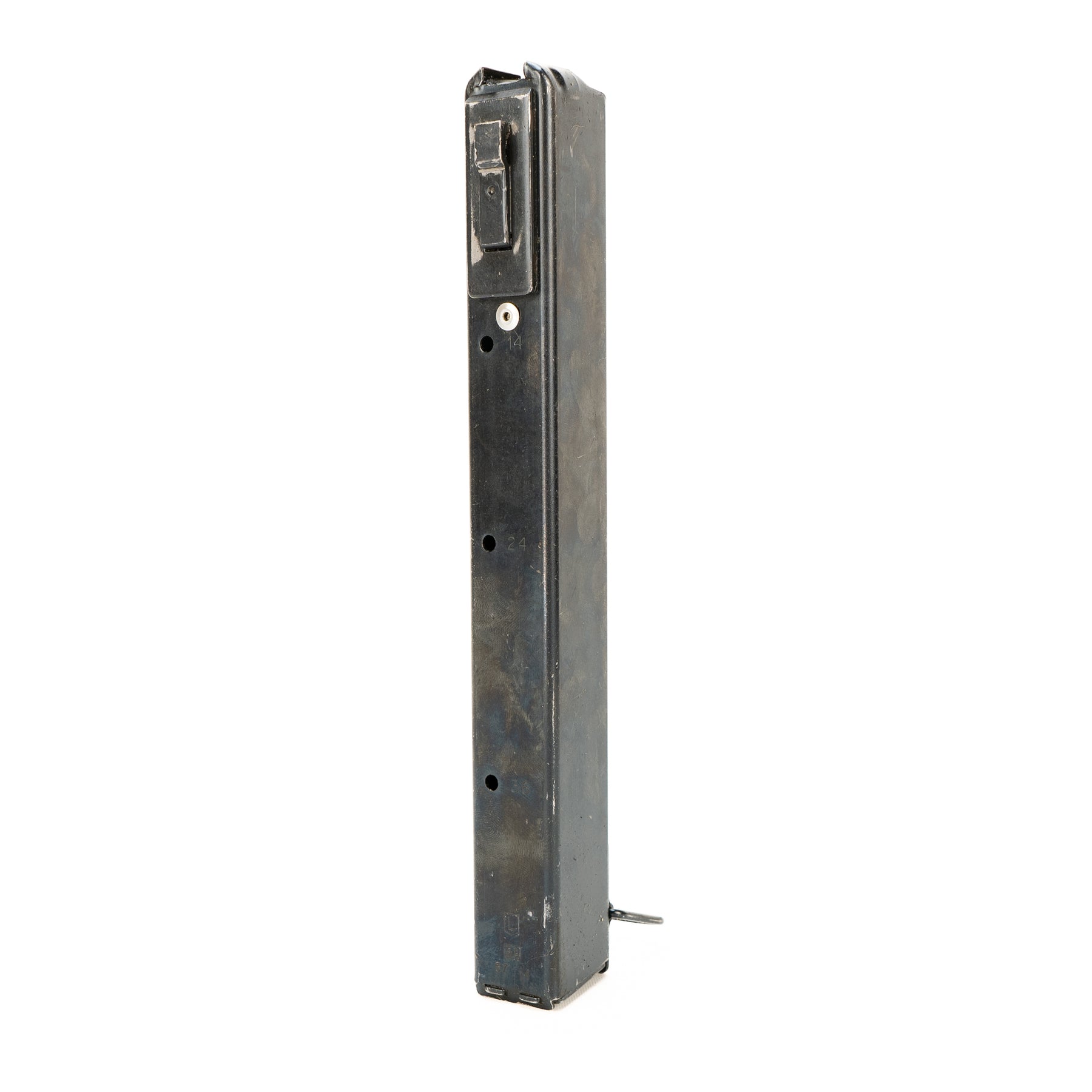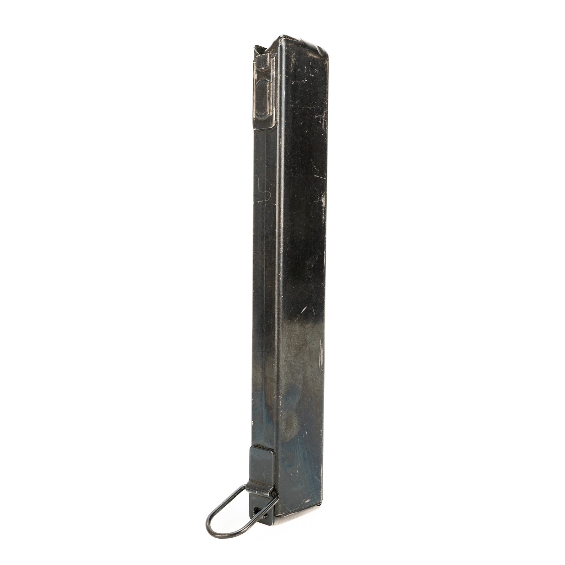 A 32 round metal magazine for the Finnish Suomi M31 9mm rifle, pinned to 5 rounds as per Canadian laws.