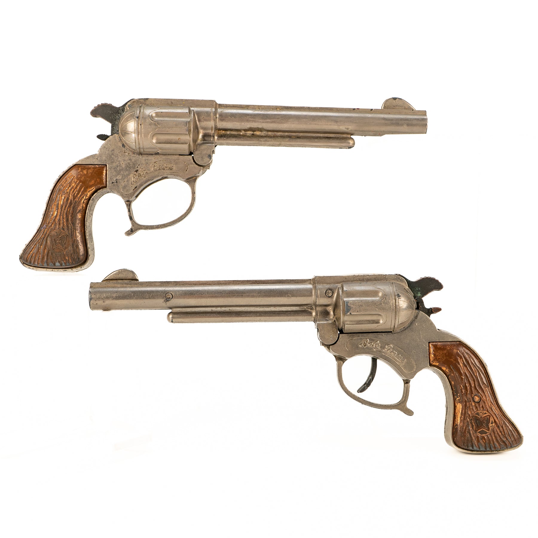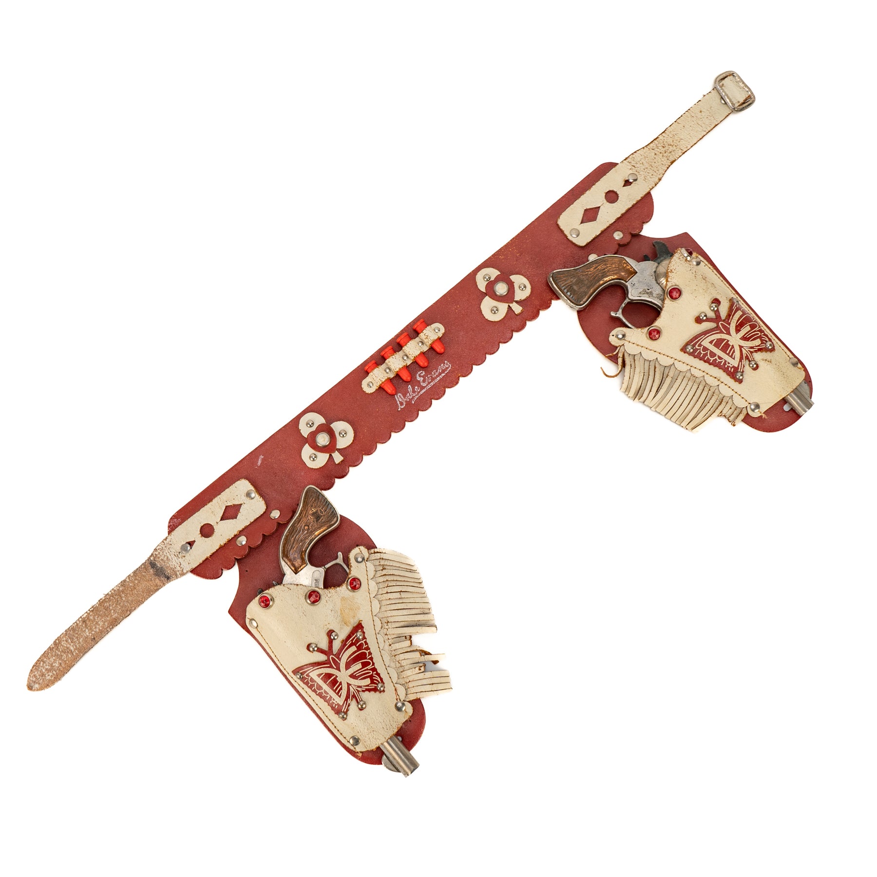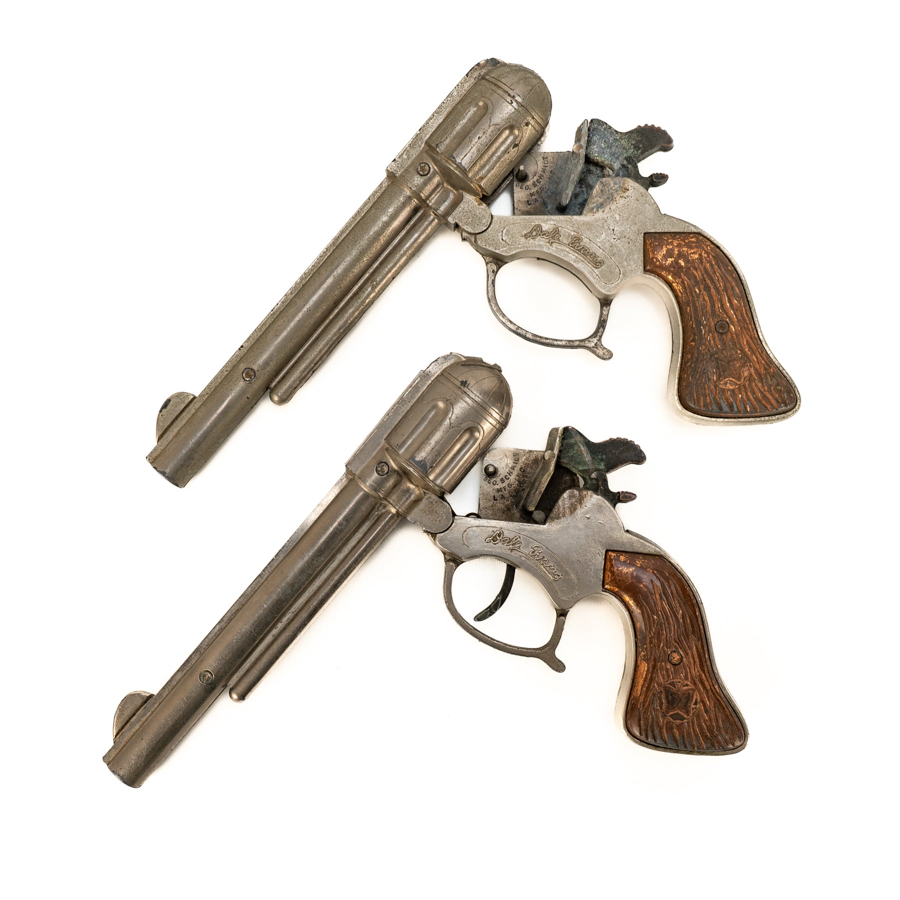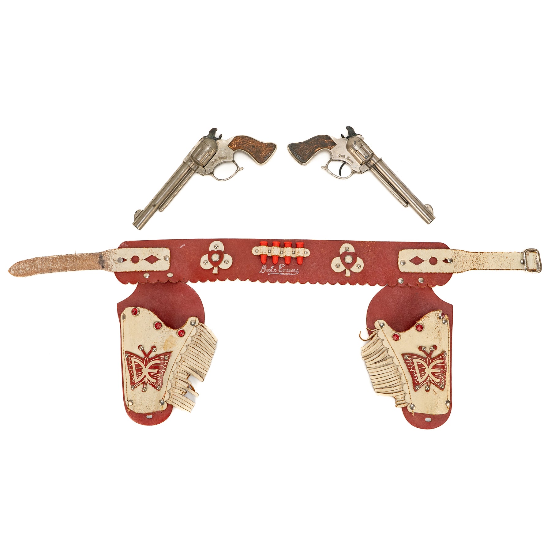 A nice set of George Schmidt Dale Evans cap guns with the matching double leather holster. There is some significant corrosion from fired caps on the hammer and the interior of the cap guns. It's definitely a played-with set, but an excellent display piece none the less!