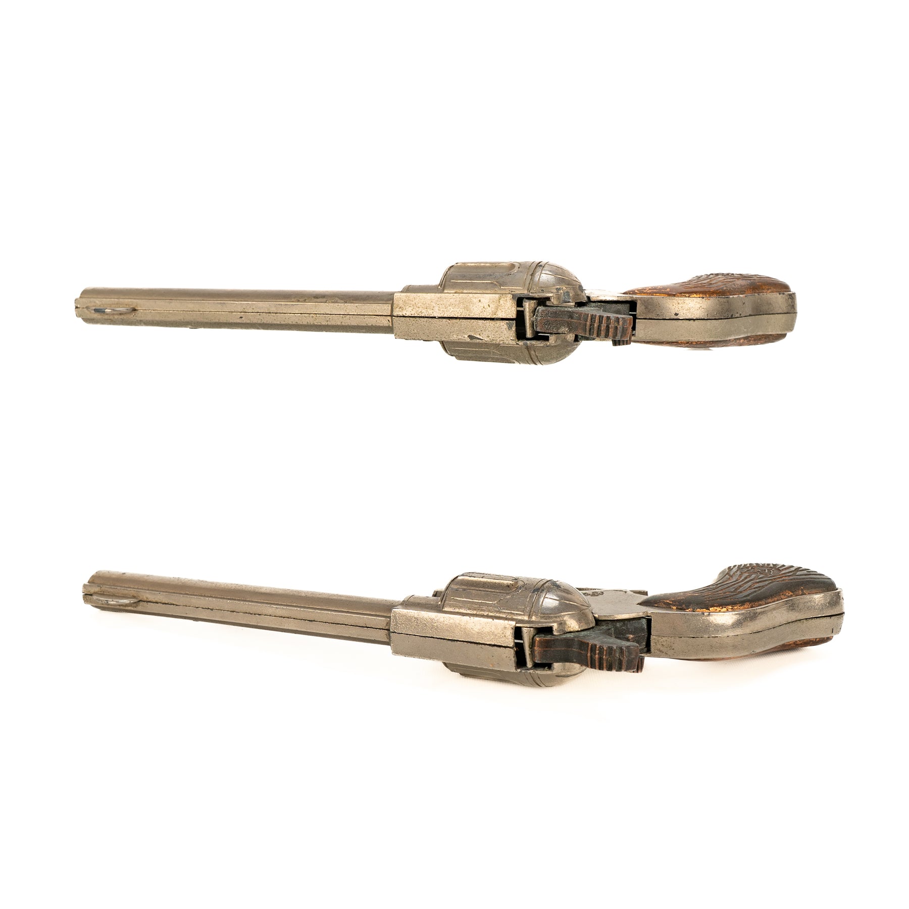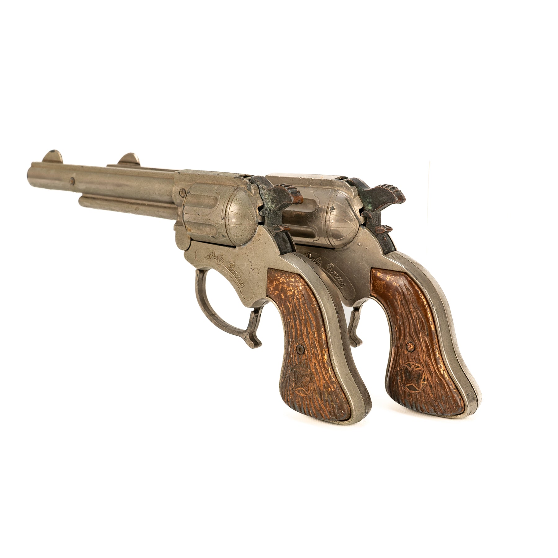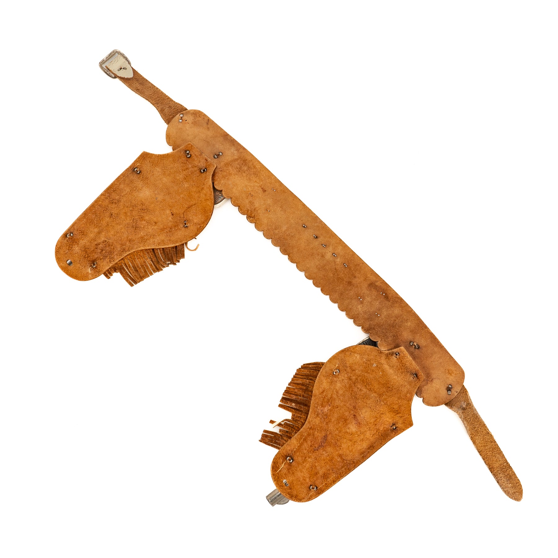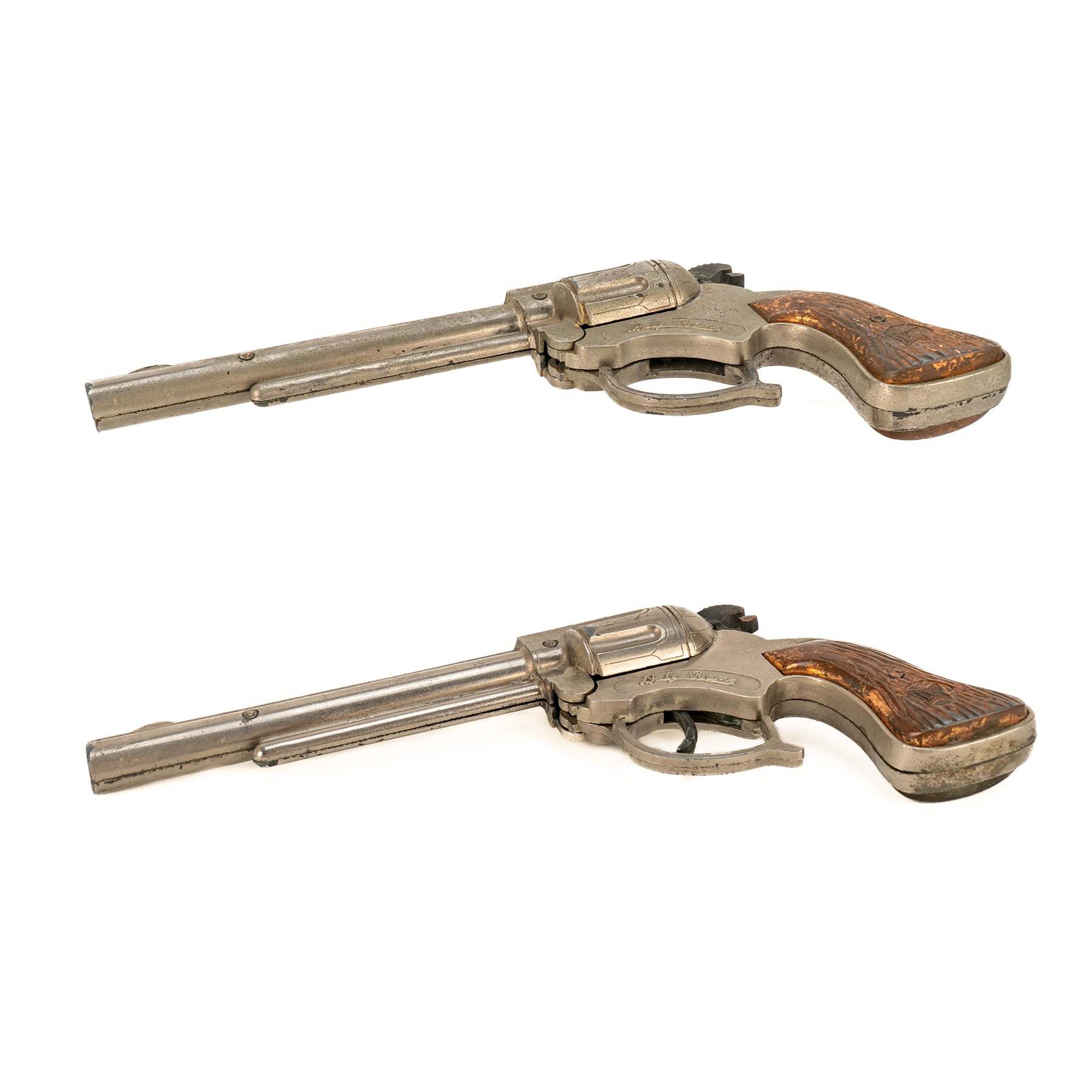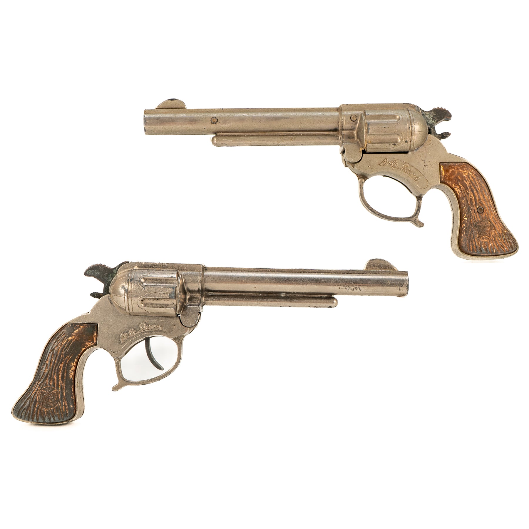 A nice set of George Schmidt Dale Evans cap guns with the matching double leather holster. There is some significant corrosion from fired caps on the hammer and the interior of the cap guns. It's definitely a played-with set, but an excellent display piece none the less!