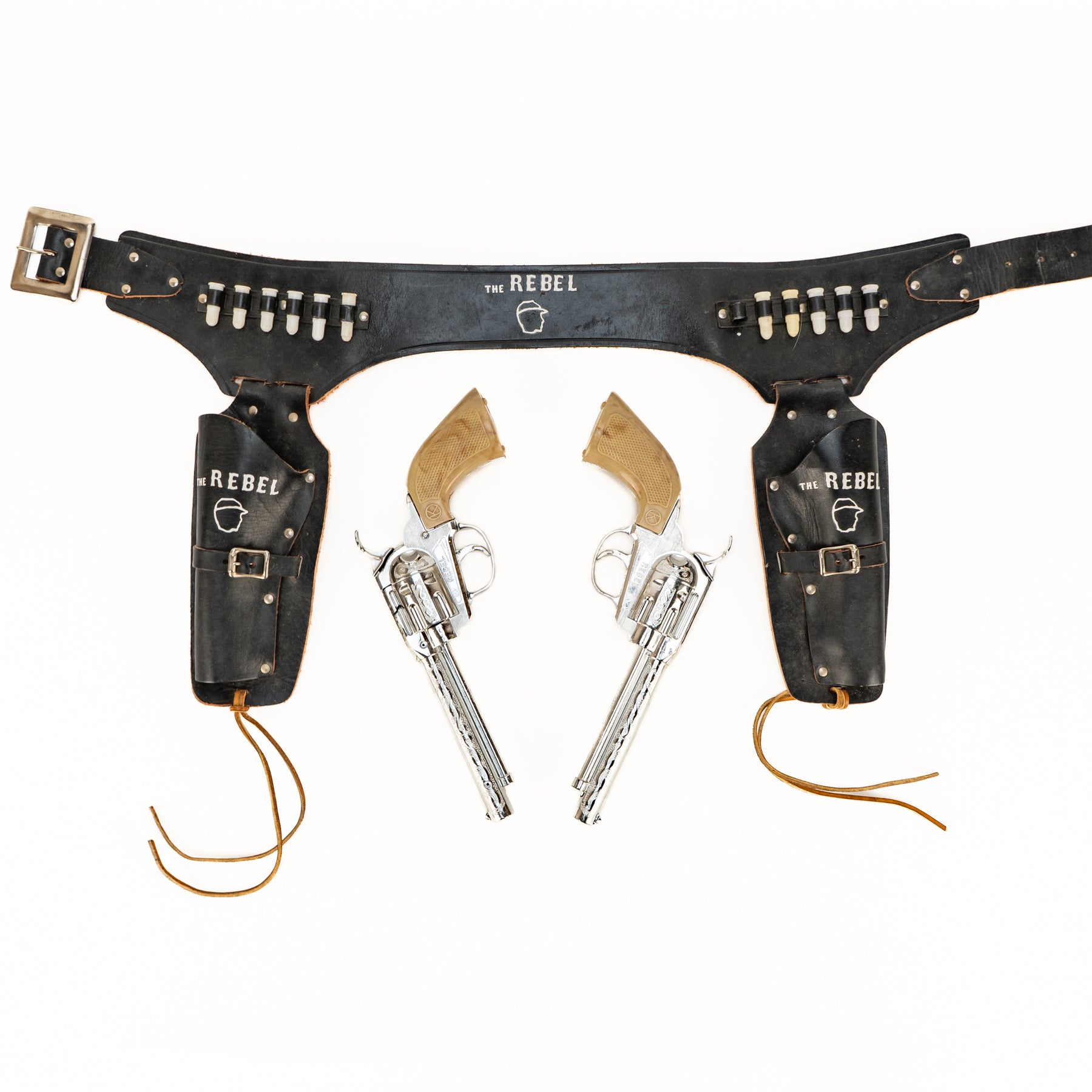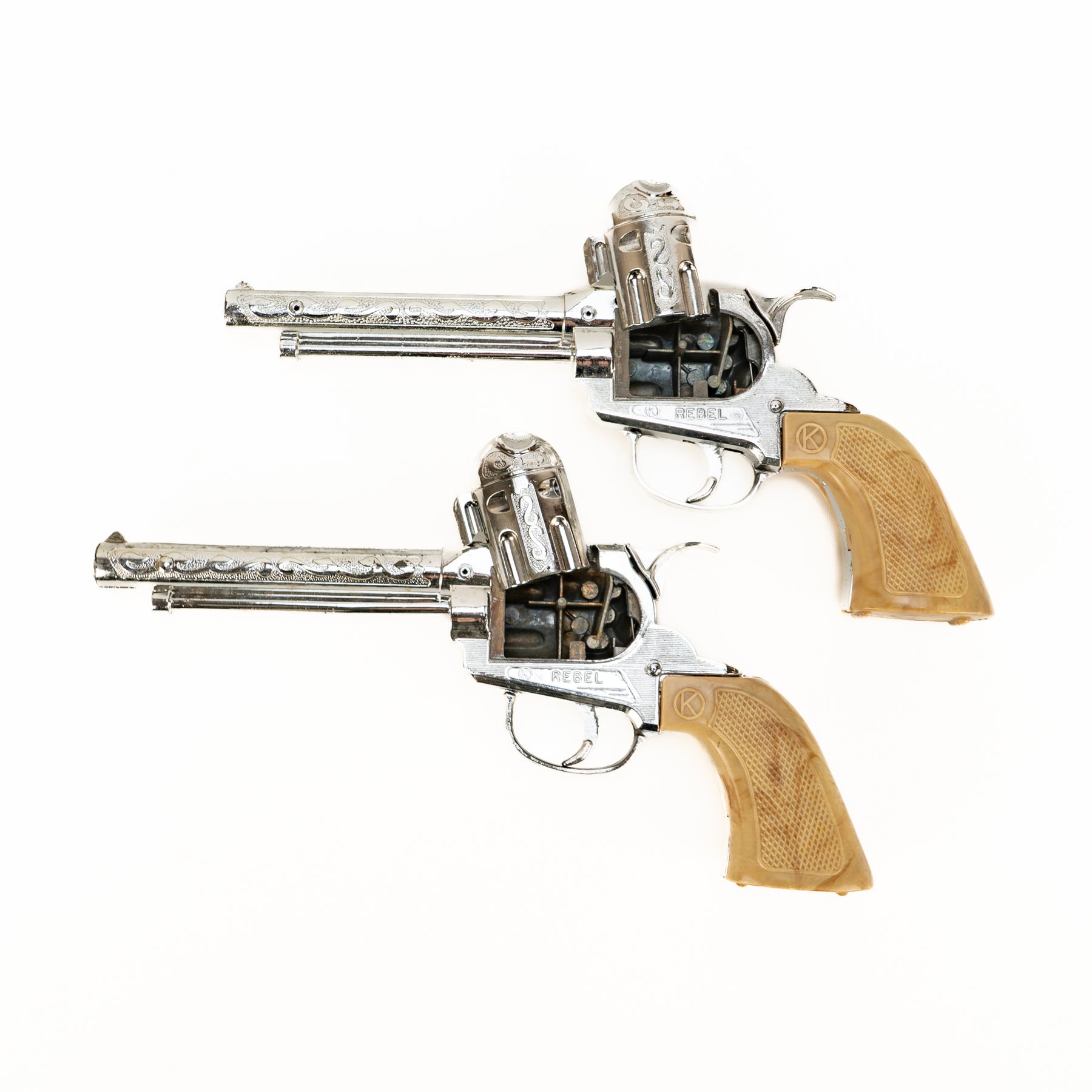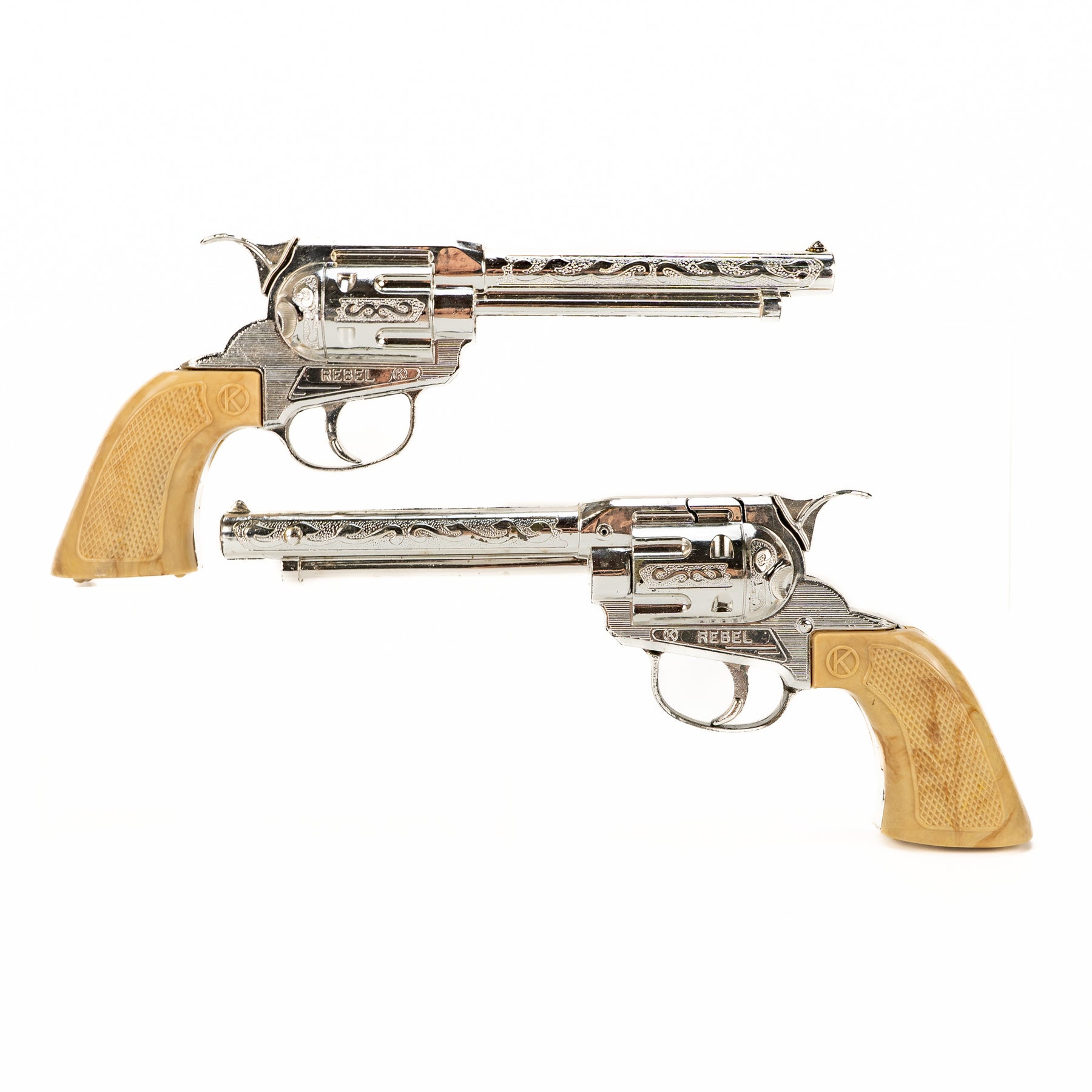 A fantastic set of Kilgore "The Rebel" cap guns & double leather holster. The cap guns are both in good working order! Missing just ONE of the white fake bullets. Please enlarge and examine all photos to see condition!