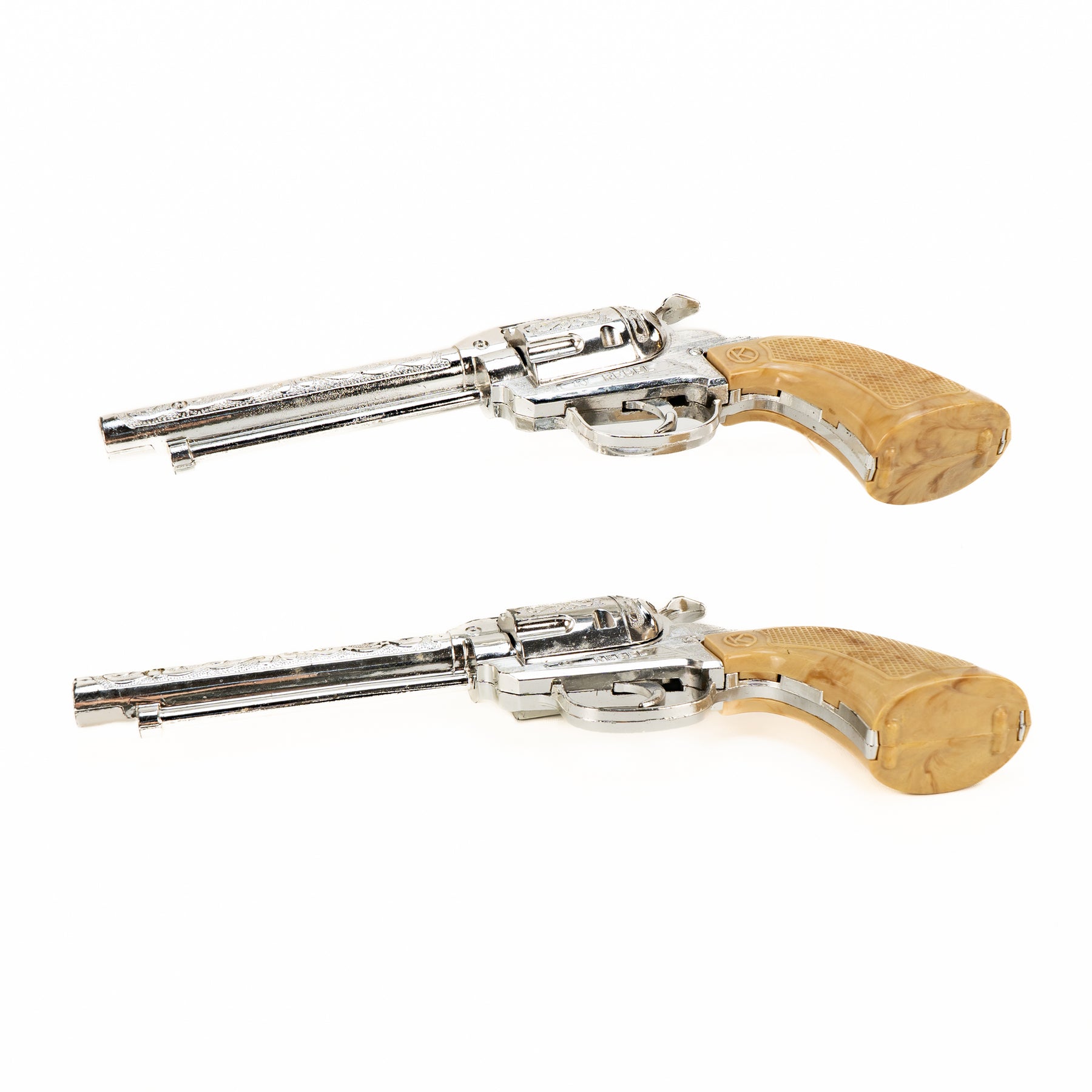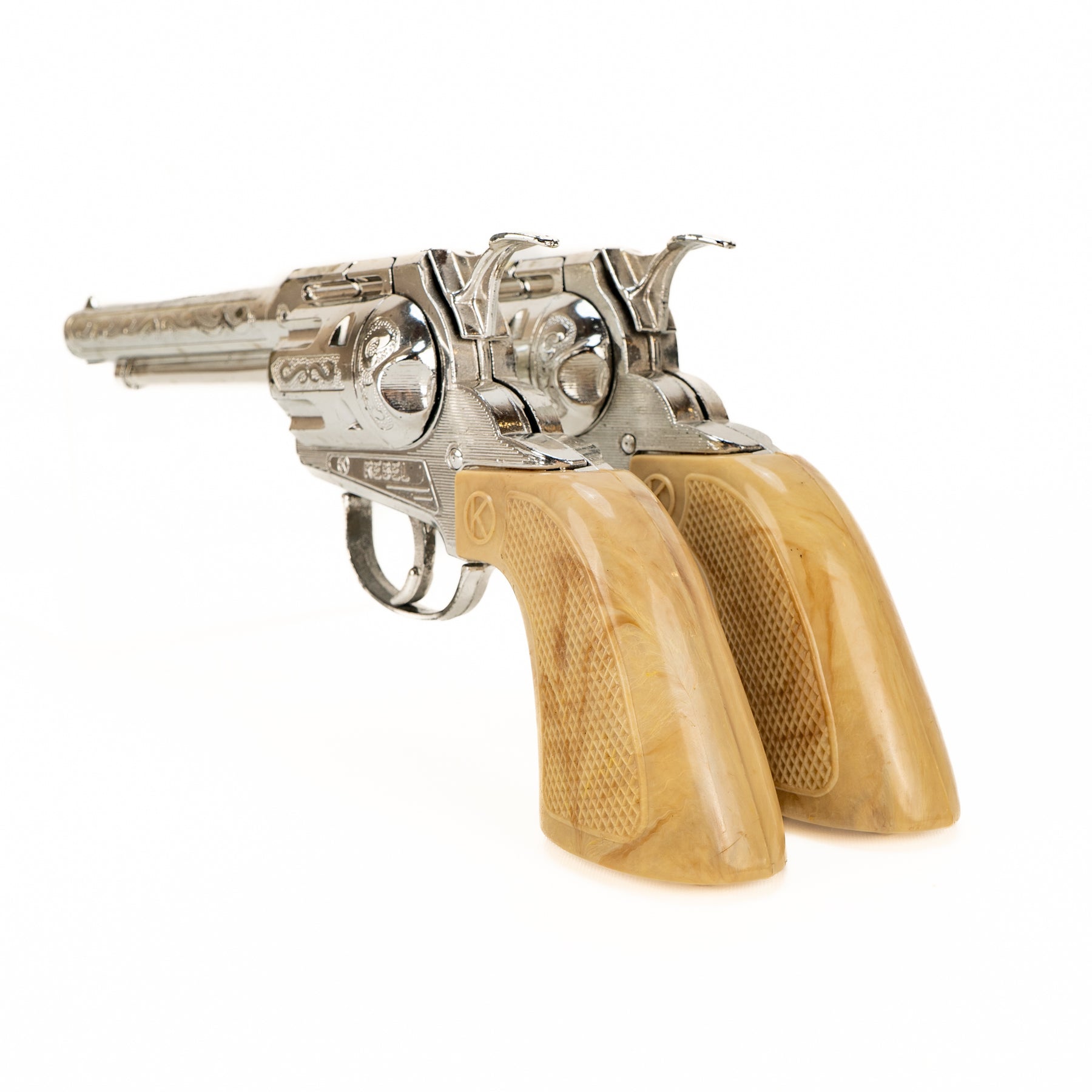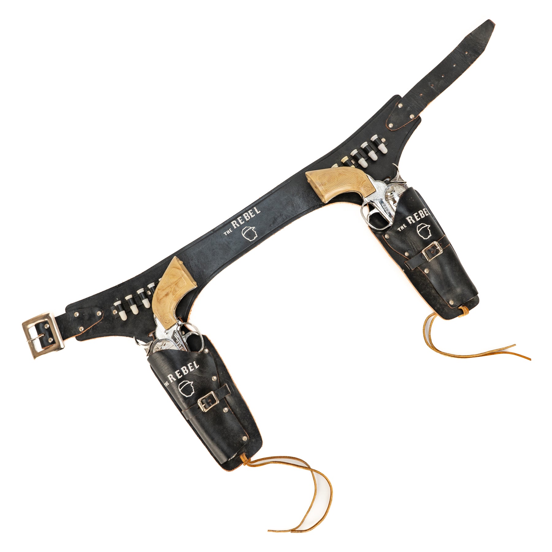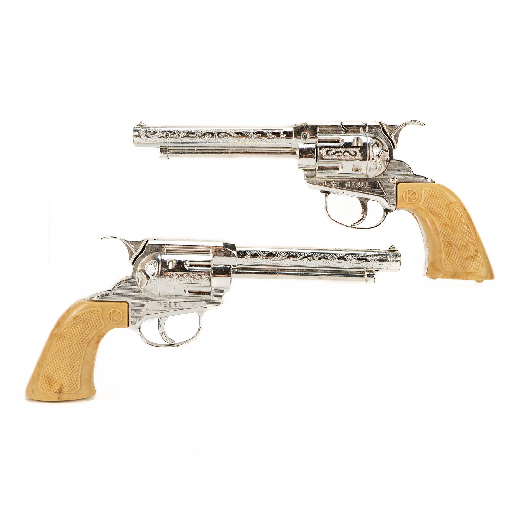 A fantastic set of Kilgore "The Rebel" cap guns & double leather holster. The cap guns are both in good working order! Missing just ONE of the white fake bullets. Please enlarge and examine all photos to see condition!