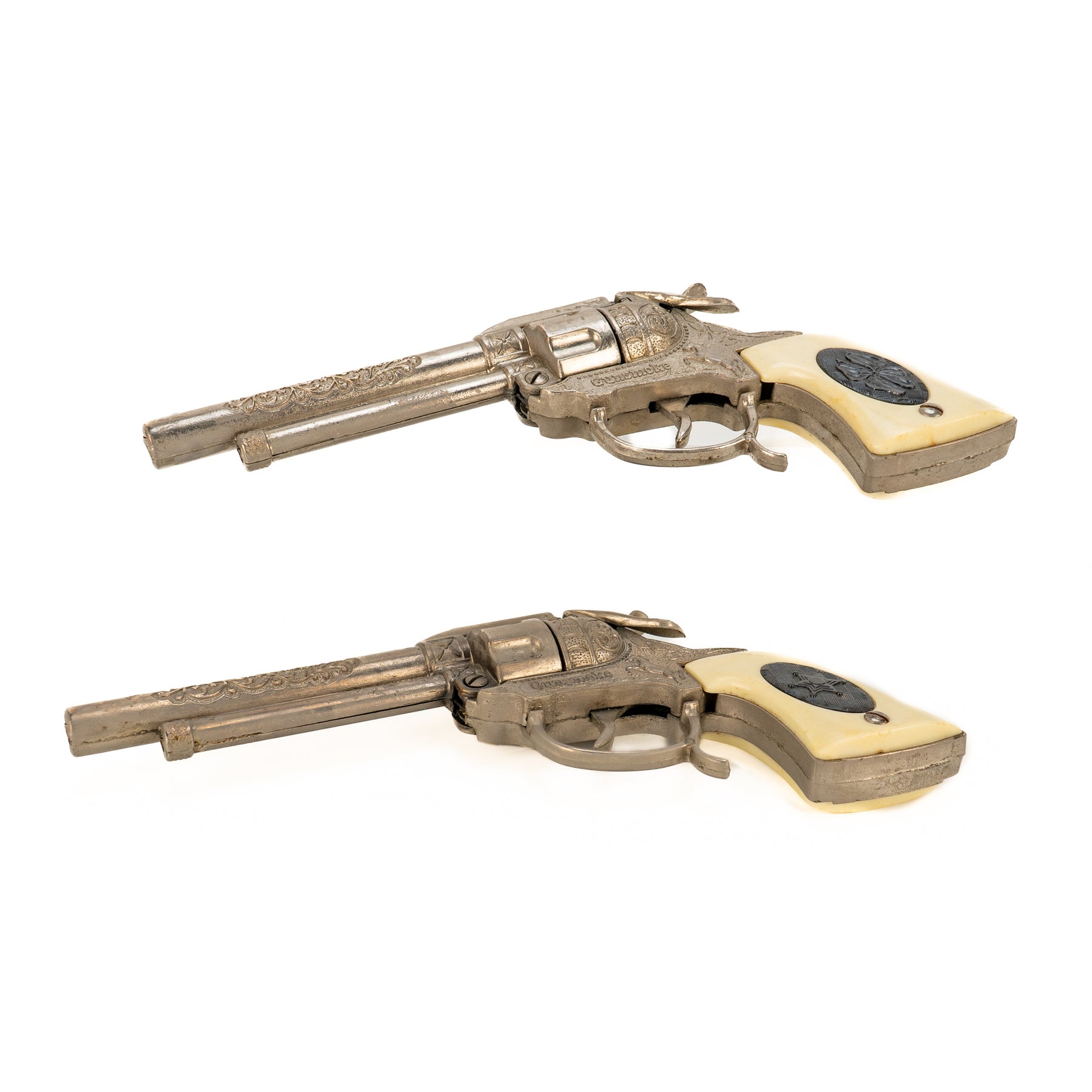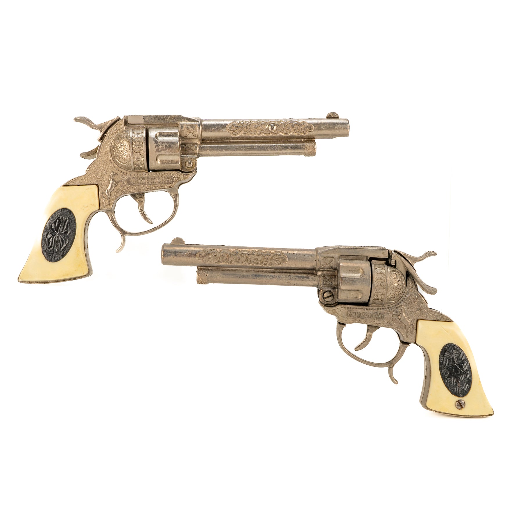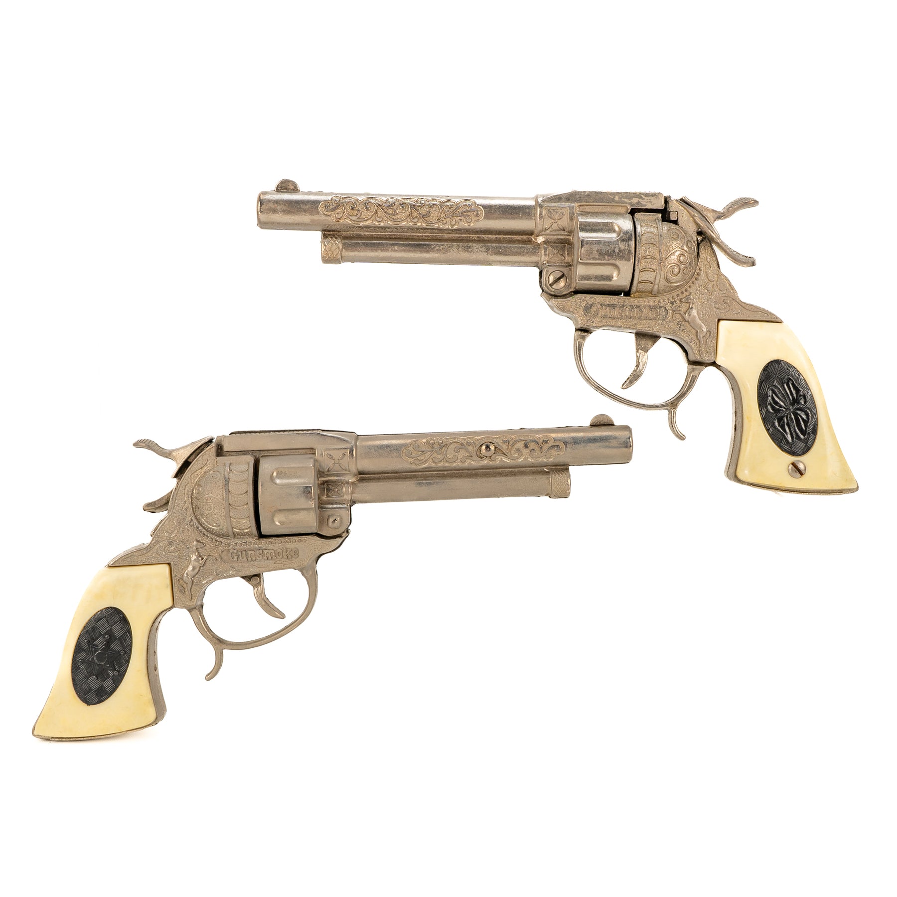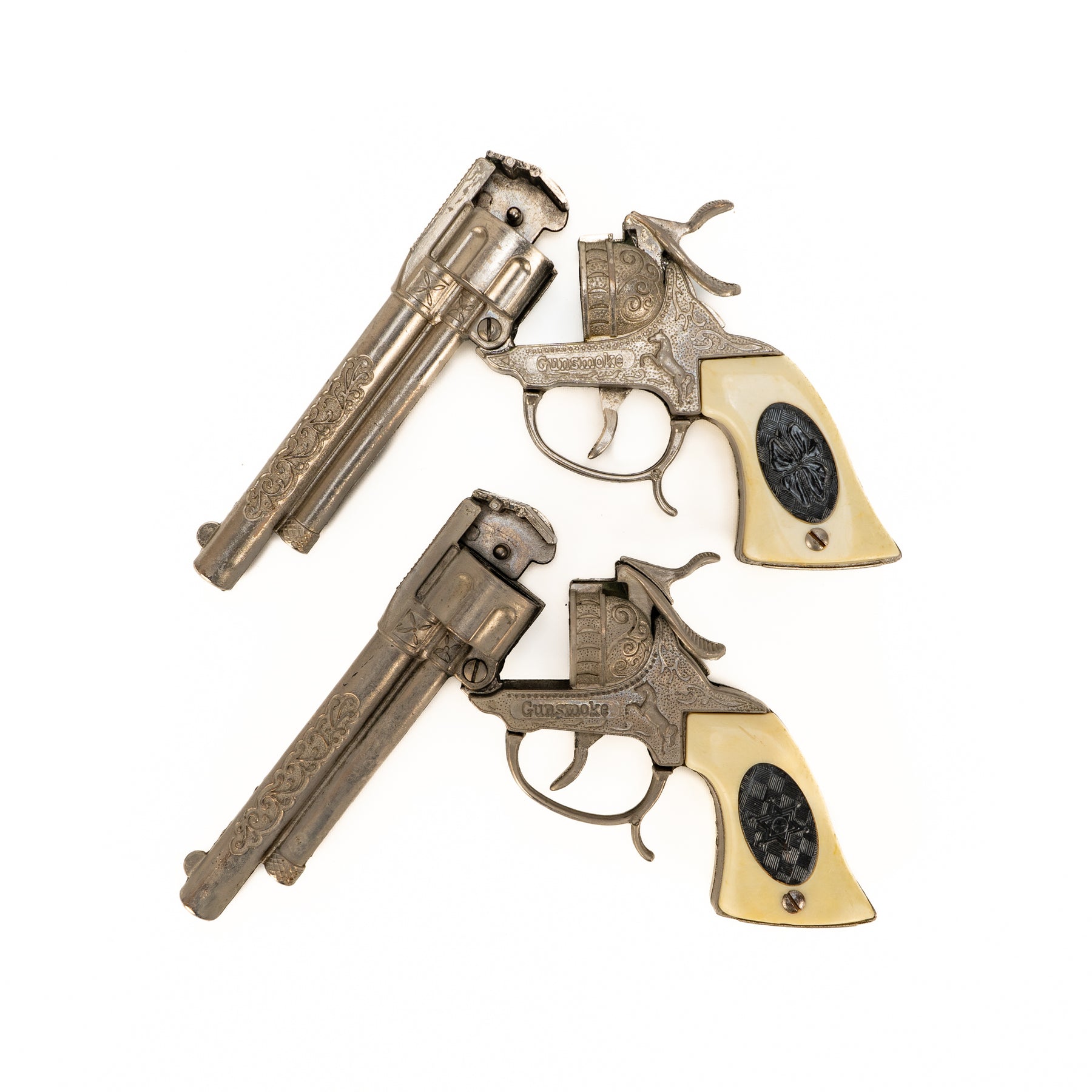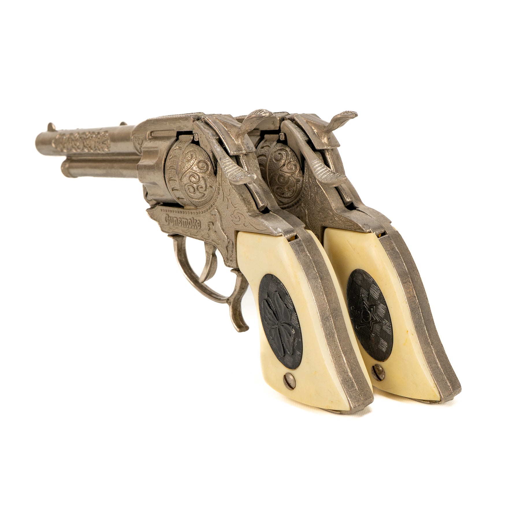 A nice set of Leslie Henry Gunsmoke 'Marshal Matt Dillon' cap guns with the original double leather holster.