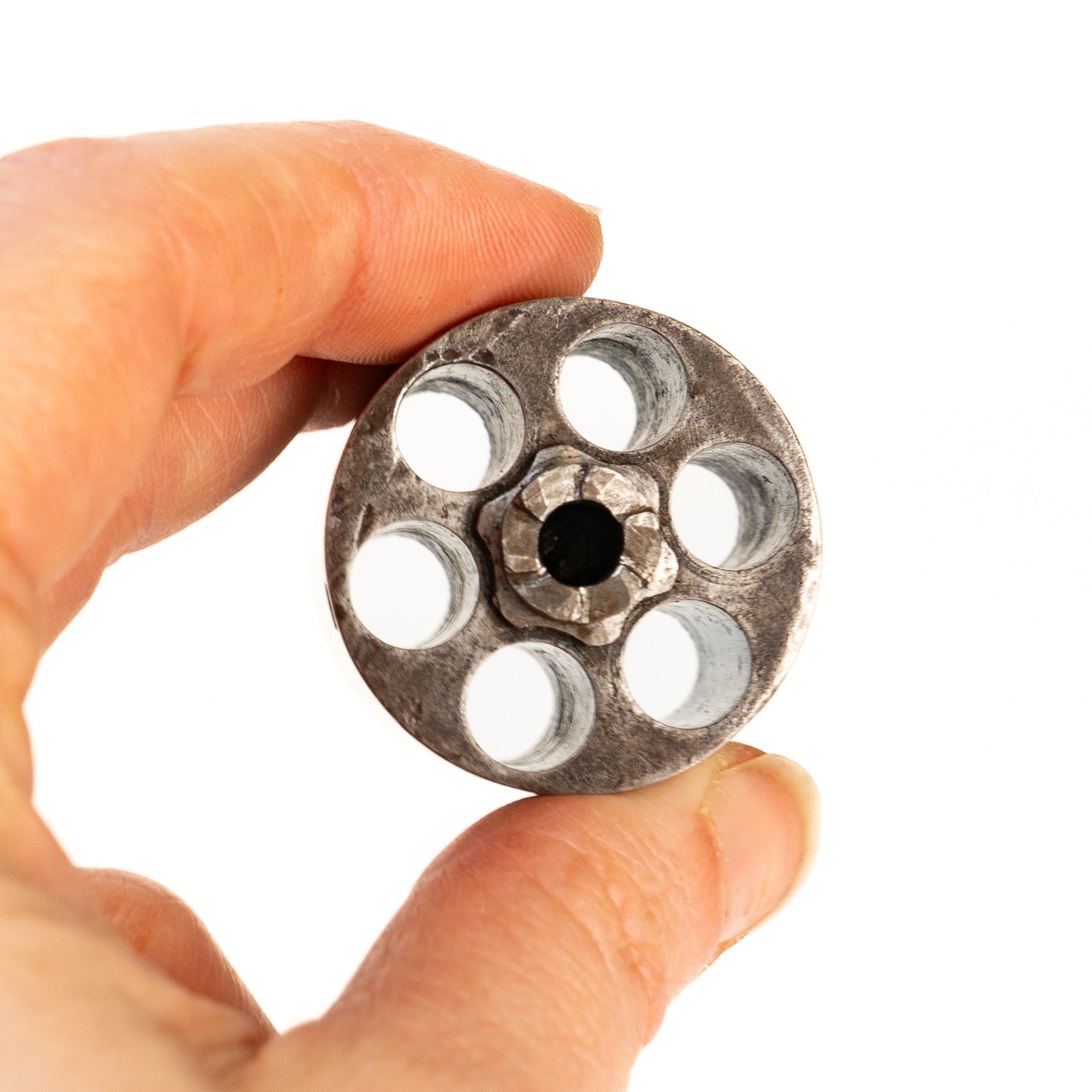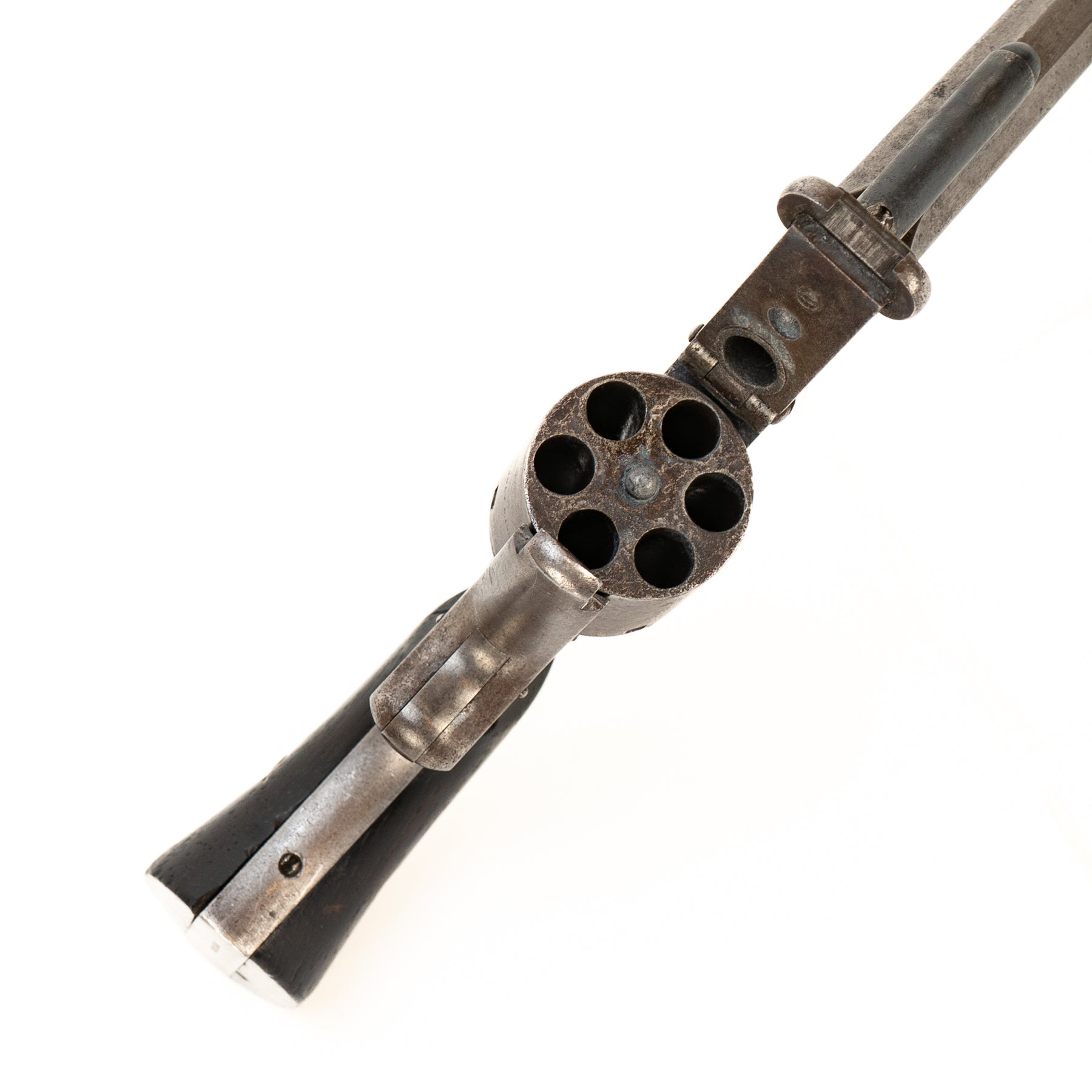 Bore is clean with good rifling. Lockup is tight, and trigger is nice and responsive. Metal has some wear and handling marks, and the right hand wood grip has a repaired crack.