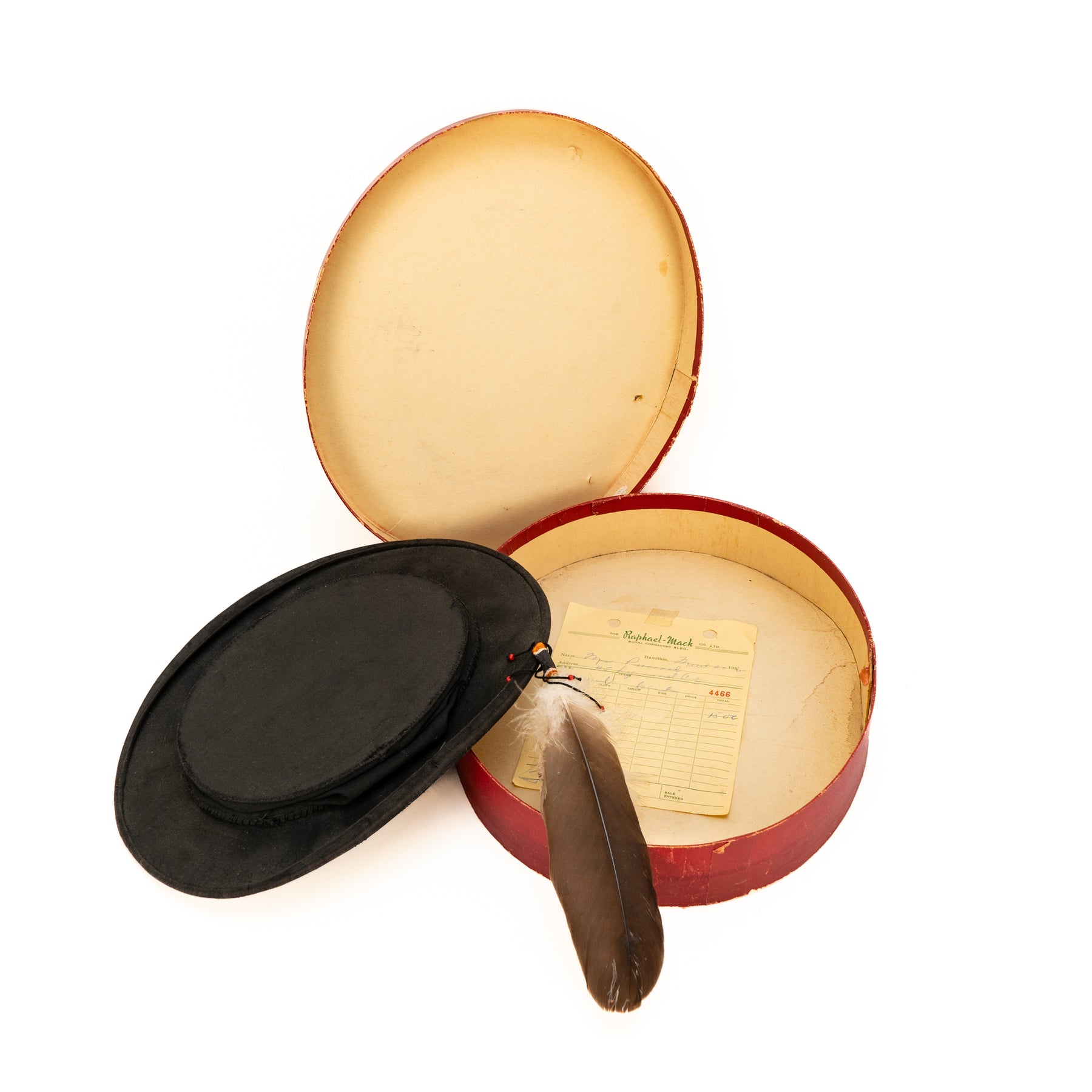 A super-snazzy vintage collapsing top had made by Christys England, ornamented by a lovely Canadian First Nations lady with an eagle feather and red beads.