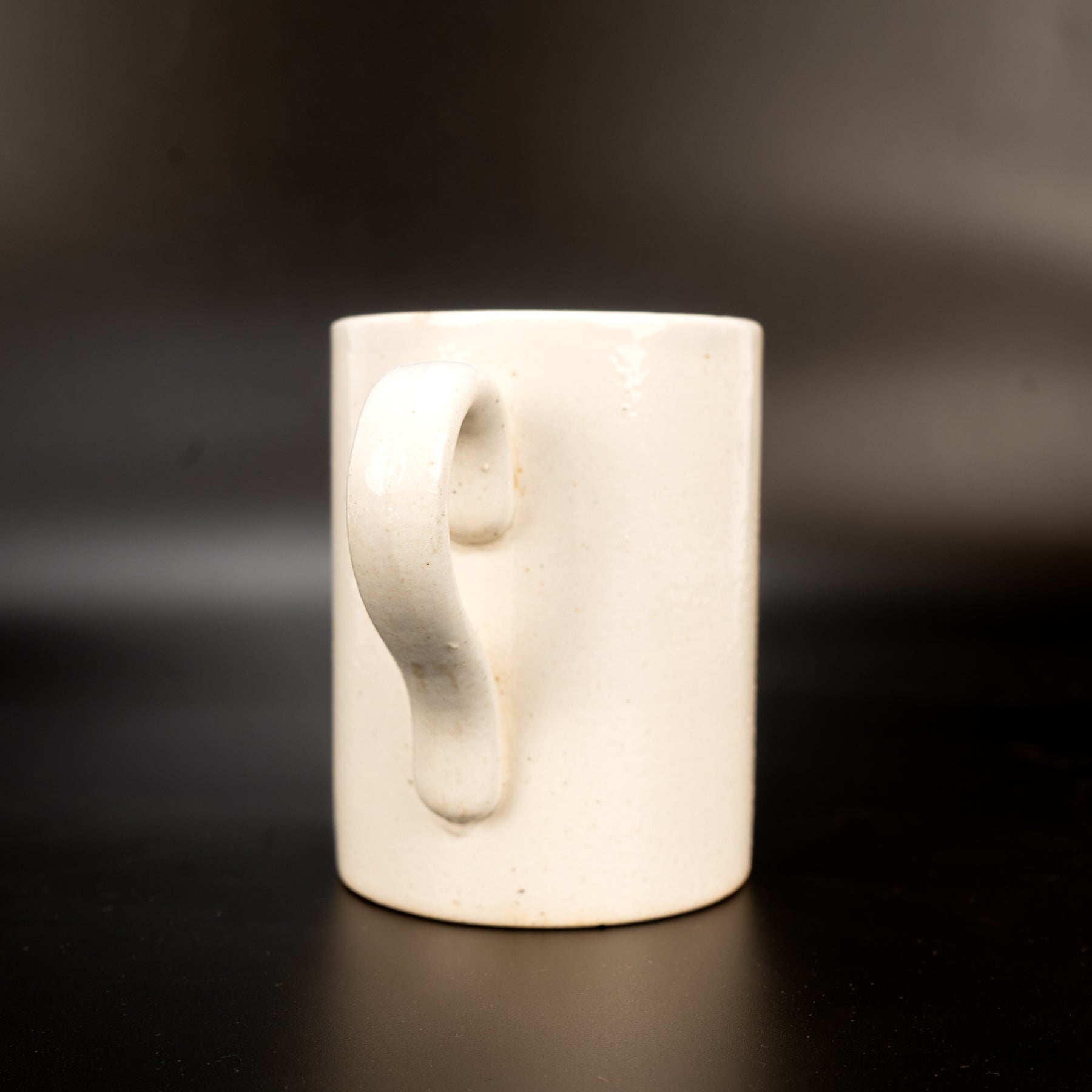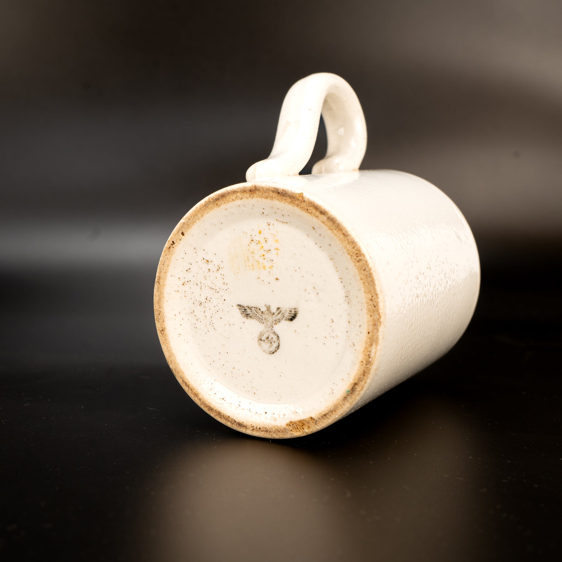 A World War II Nazi German Wehrmacht Mess Hall Coffee Mug. White glazed ceramic with the German eagle mark to the base. There is one very old chip to the bottom rim - barely visible even if you're staring straight at it, and not visible at all when the cup is sitting vertical.