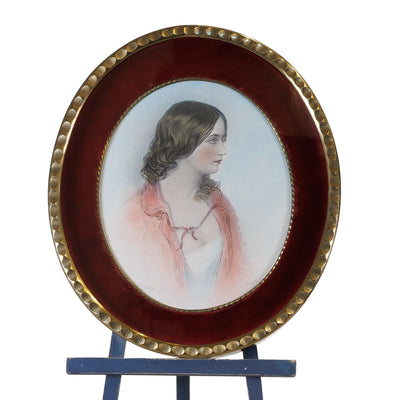 A stunning 19th century engraving by Francis Holl after a piece of art by James Fisher. A tinted image of a woman casually draped in a pink coat, gazing gently out of frame to the right.