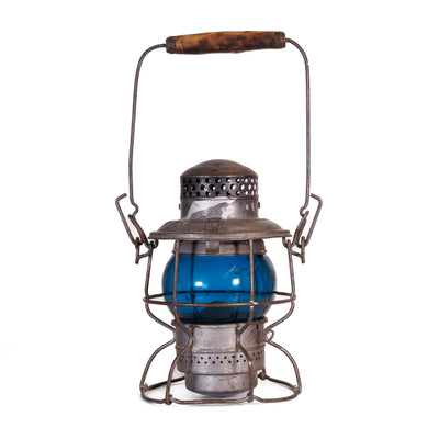 This lantern was made by Hiram Piper for the Canadian Pacific Railway, and was meant to be held in the hand as a signalling device. In this case, a green light meant a few things from indicating that the switches were aligned properly, to "Proceed with caution". There are a few other meanings as well, but I'll leave those for the railway experts out there.
