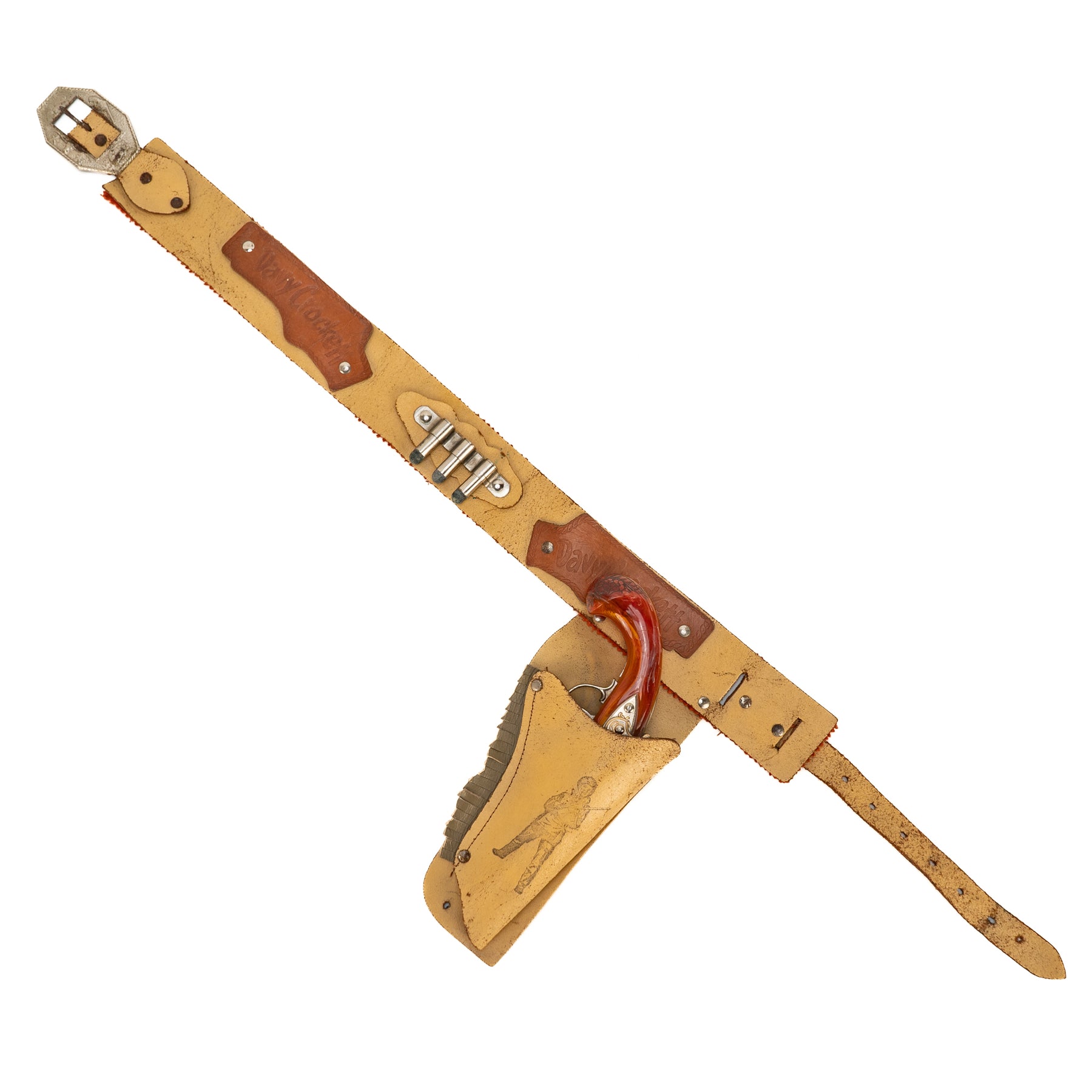 A nice Hubley Davy Crockett double hammer pistol with the original leather holster. The cap gun is in good working order! Both hammers pull back and hold, and the two-stage trigger fires one first, and then if you pull a little more it will fire the second one. A great little design! The bullets in the belt are fired/inert 38 special cartridges, and it came to us with those in there.