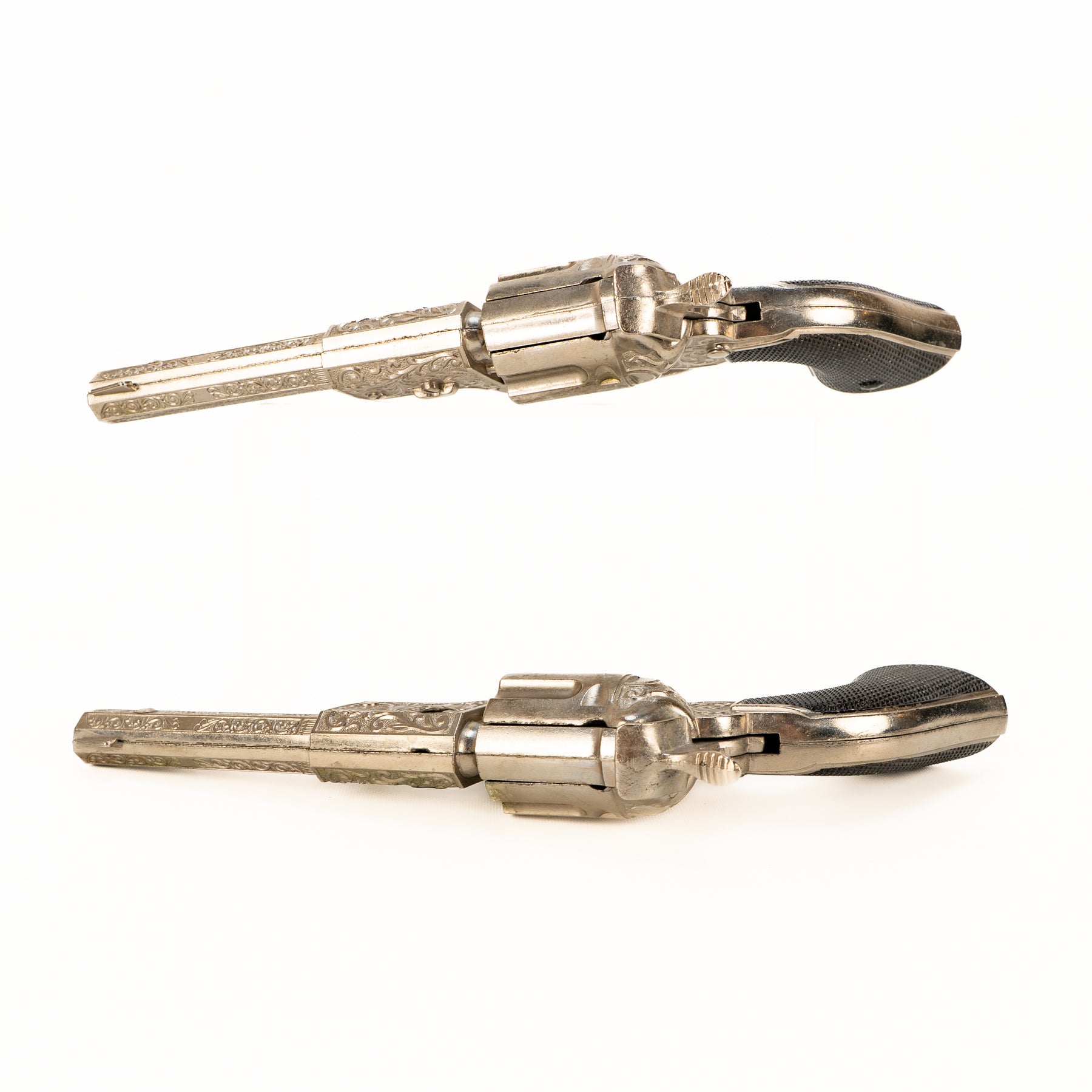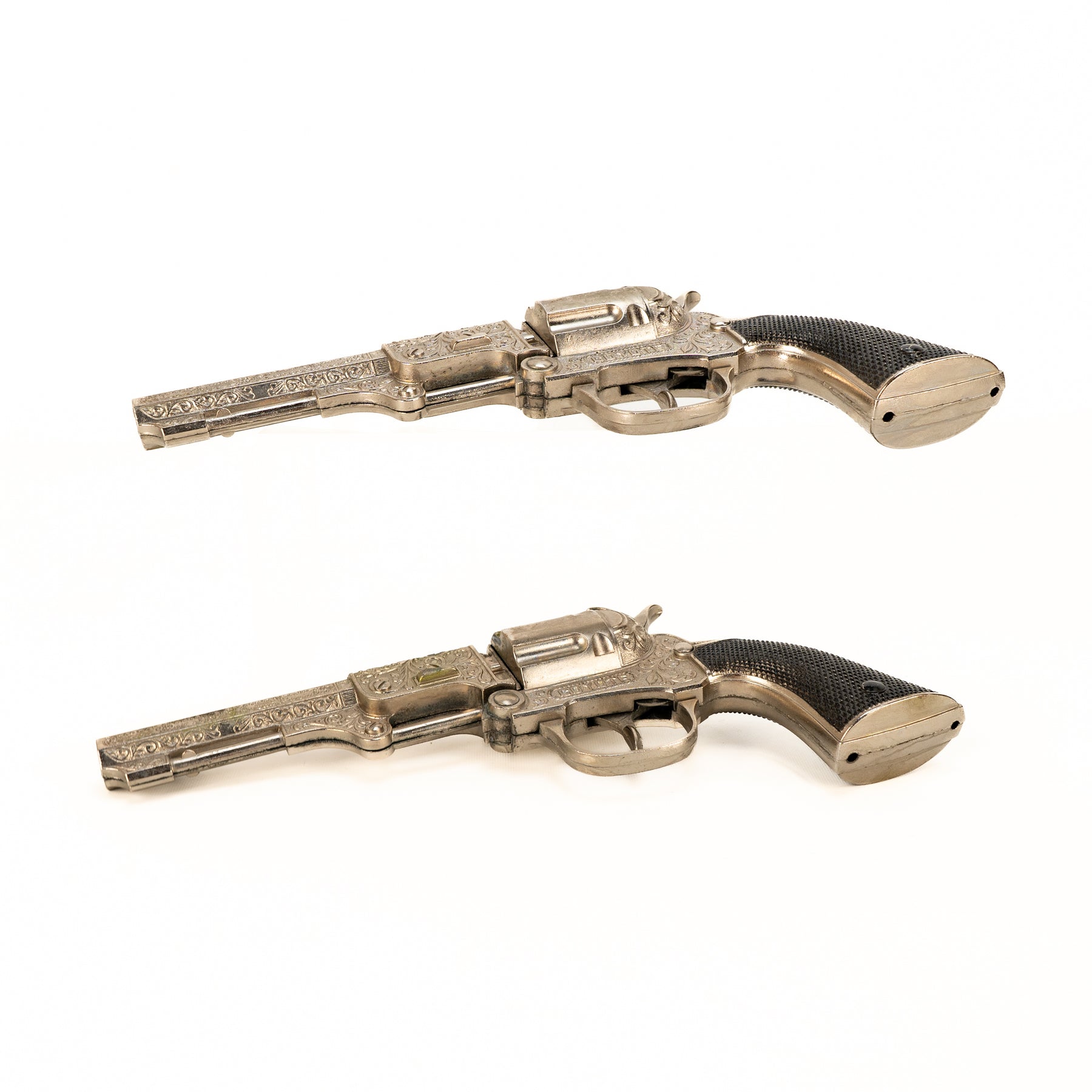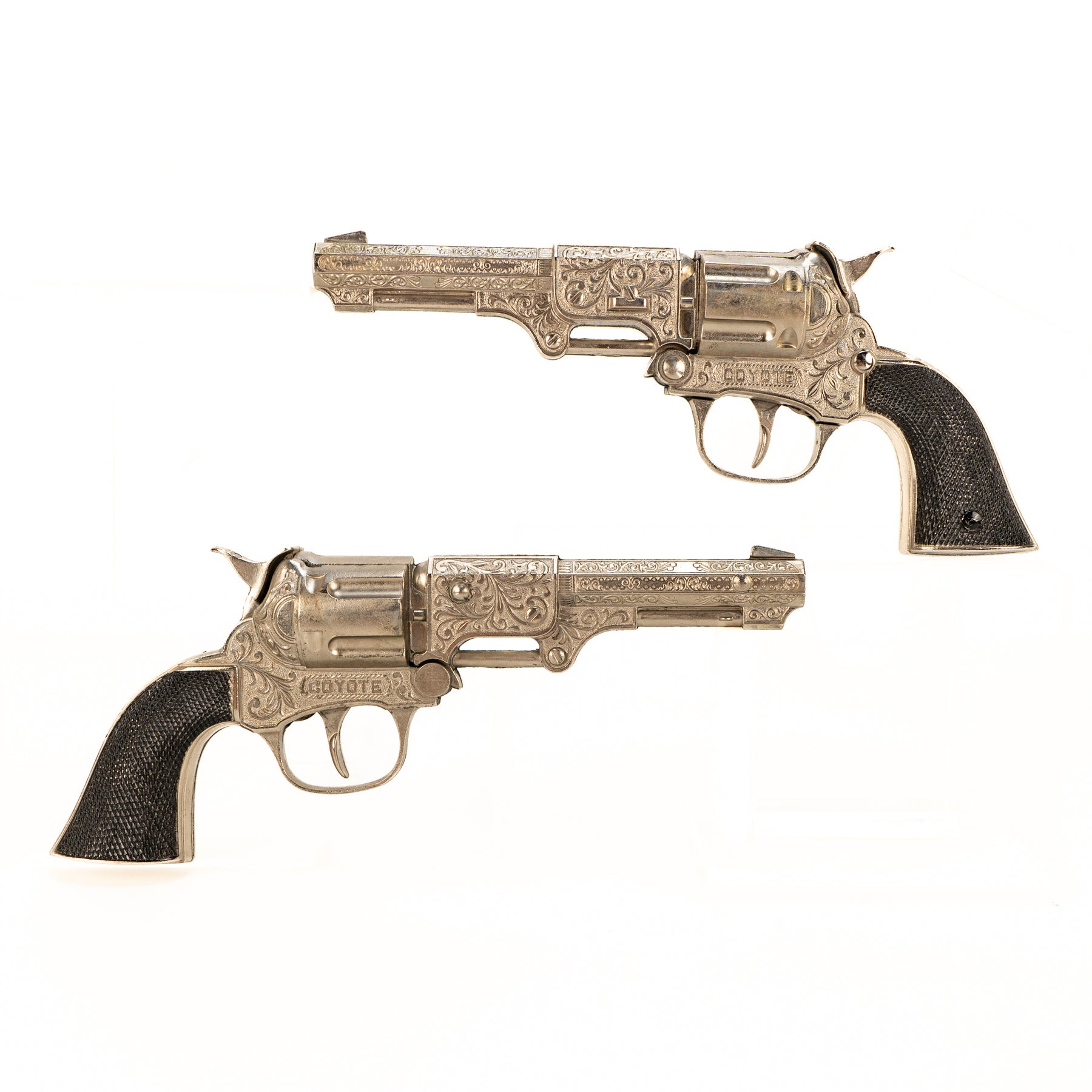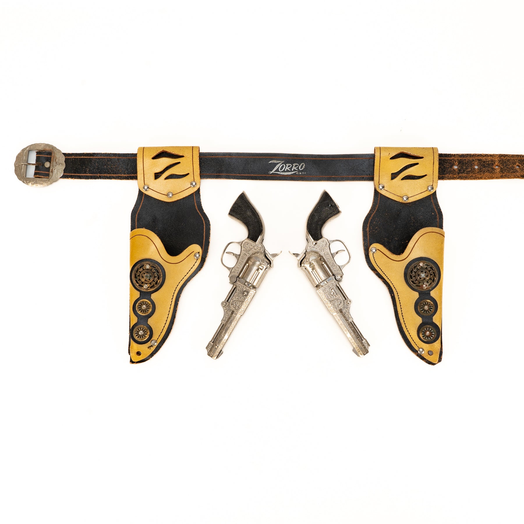 A fantastic complete set of 1960's Hubley Zorro Coyote cap guns with the original Zorro double leather holster! Both cap guns are in good working order, and the holster is in beautiful condition. Please examine all the photos to see condition.