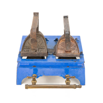An exceedingly rare piece, this gas sad iron heater has been beautifully enameled in blue, with copper fittings to provide gas to the two burners. The removable plates on the burners are marked "CP B te SGDG PARIS", and we've paired it up with a No. 6 and No. 7 sad iron by Gendarme, a French sad iron maker. It is in overall very good condition, with the only notable damage being a crack on the left hand side above the back leg. There is some light loss of enamel, but nothing major. The smaller of the two sad irons has surface rust on the base, and could use a bit of cleaning up.