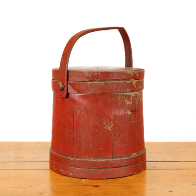 An antique wood firkin with original red paint. Some of the bands have shifted position due to the wood shrinking with age. The bentwood handle has a crack on one side, but it's quite stable and doesn't appear it's going to get any worse as long as it doesn't get mishandled.