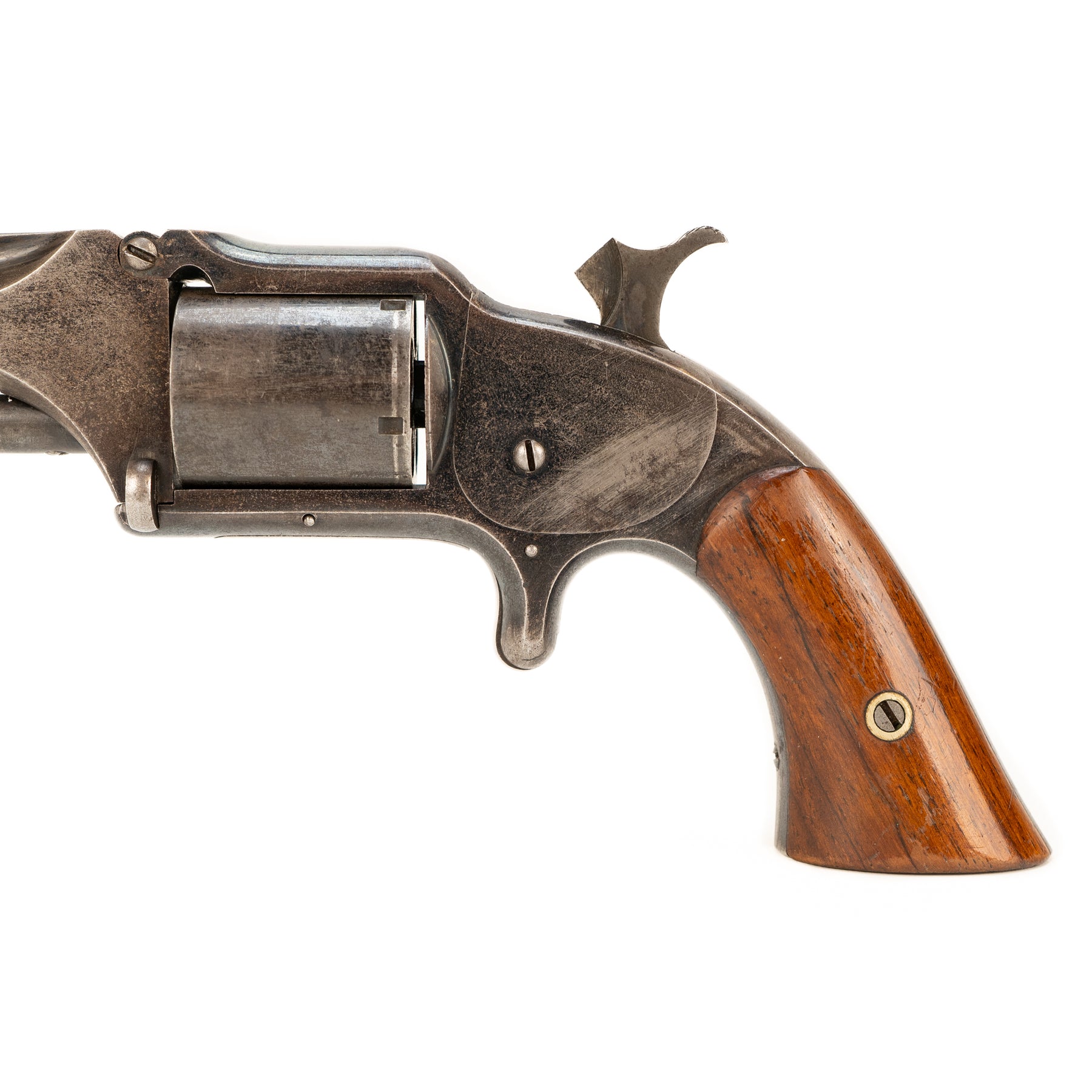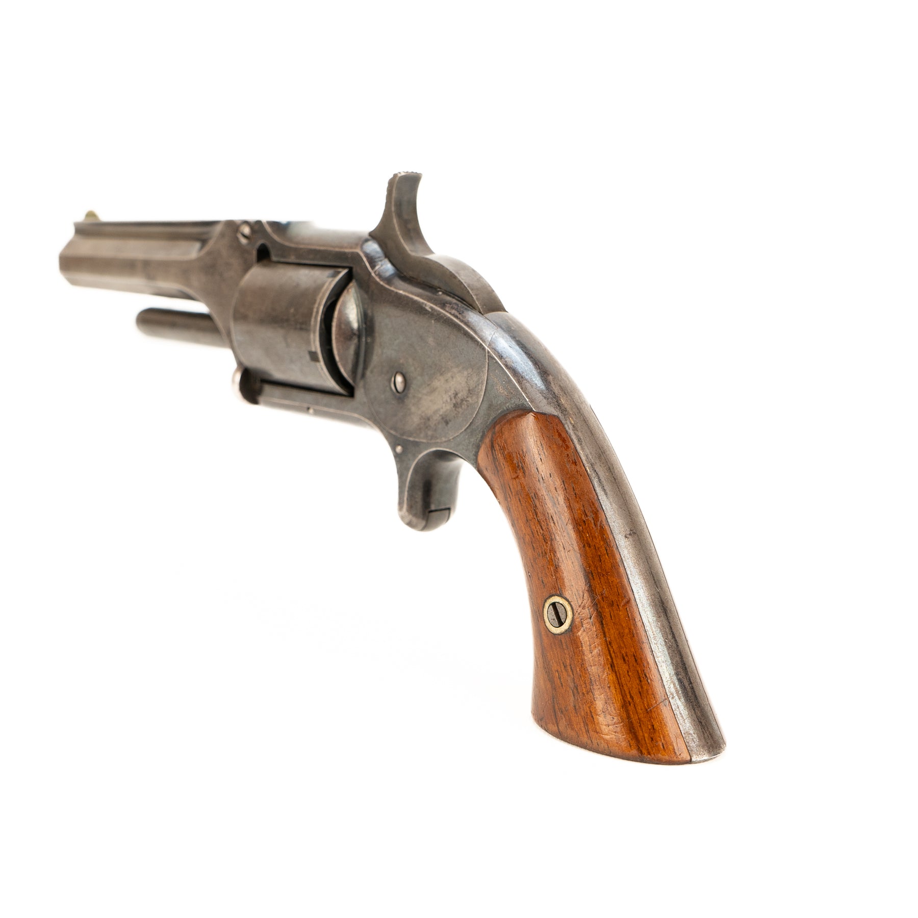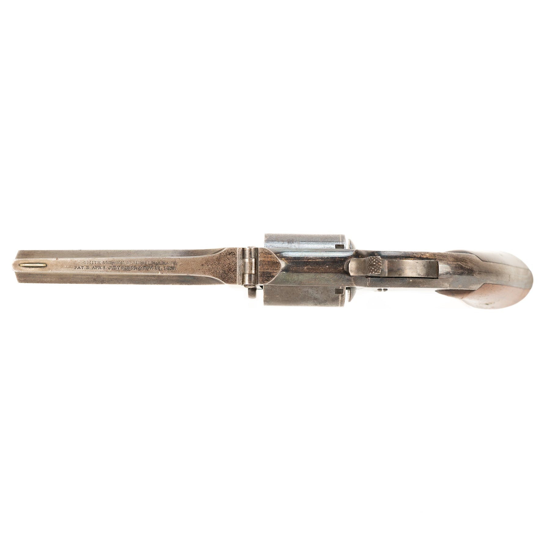 The wood grips are in gorgeous condition, and the action retains much of its original bluing with the most significant wear being on the barrel. Marked on the top of the barrel with "Smith & Wesson Springfield Mass." and patent dates of Apr. 3 & July 5 1859 as well as Nov. 21 1865.