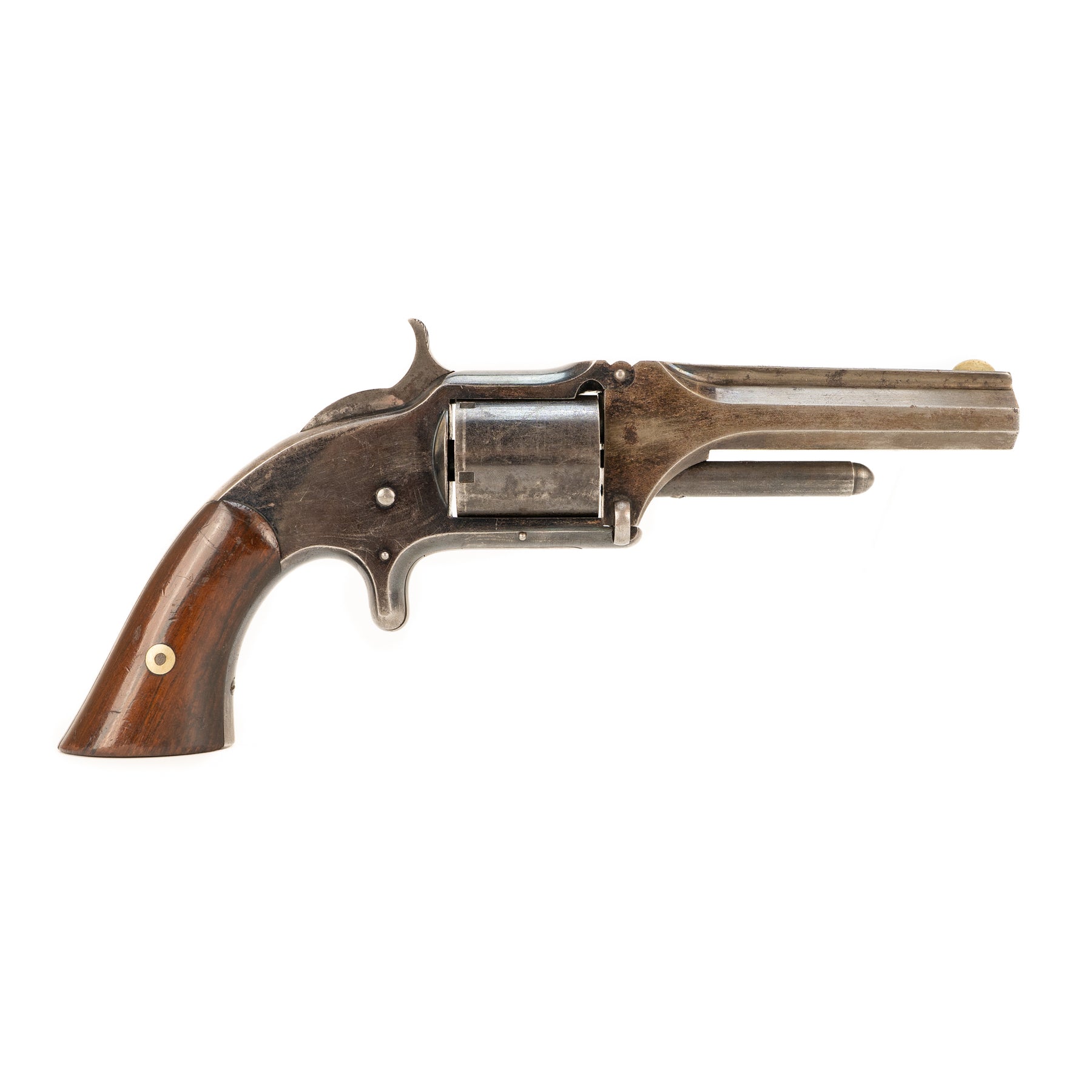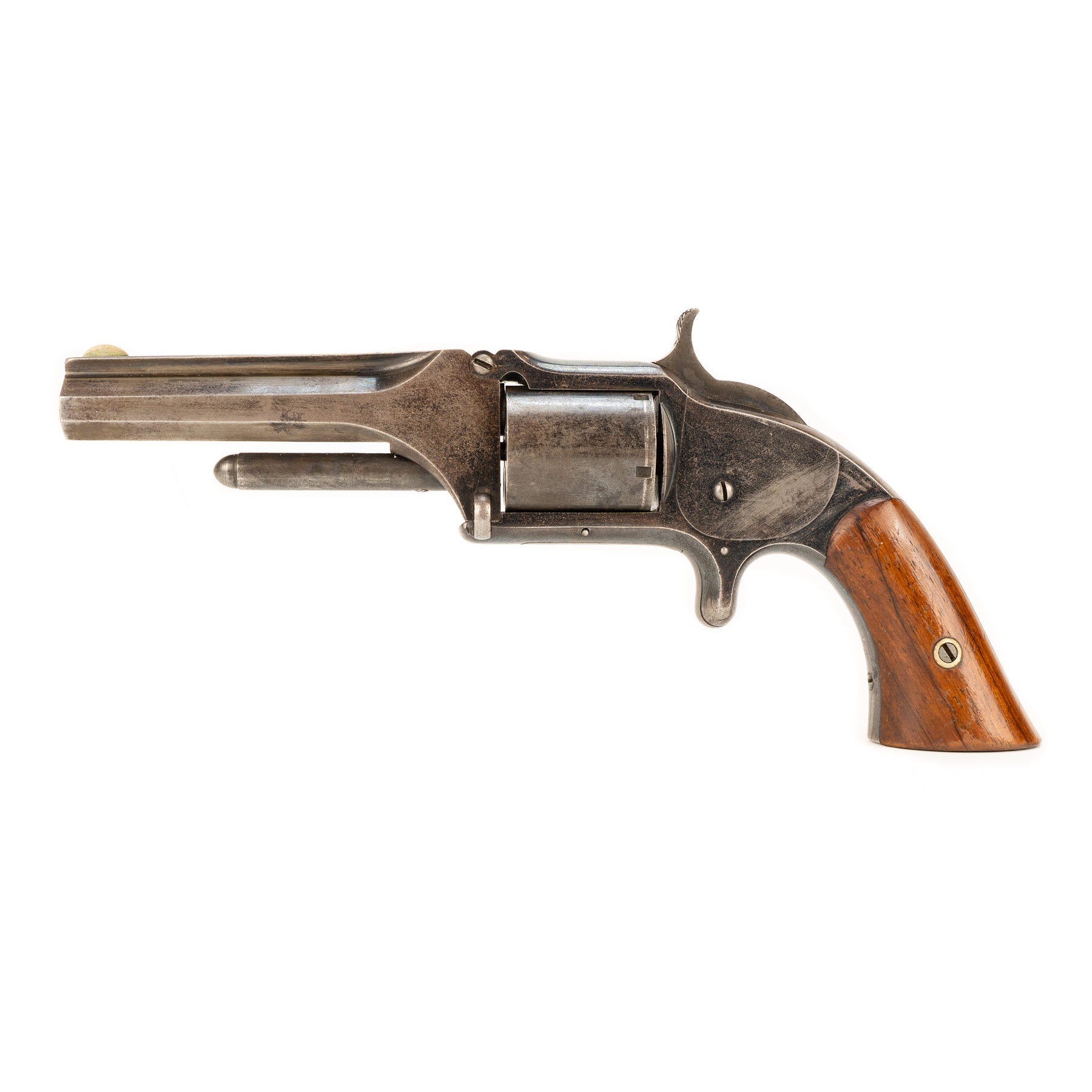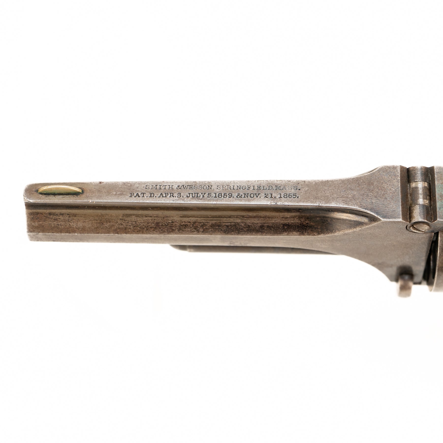 The wood grips are in gorgeous condition, and the action retains much of its original bluing with the most significant wear being on the barrel. Marked on the top of the barrel with "Smith & Wesson Springfield Mass." and patent dates of Apr. 3 & July 5 1859 as well as Nov. 21 1865.