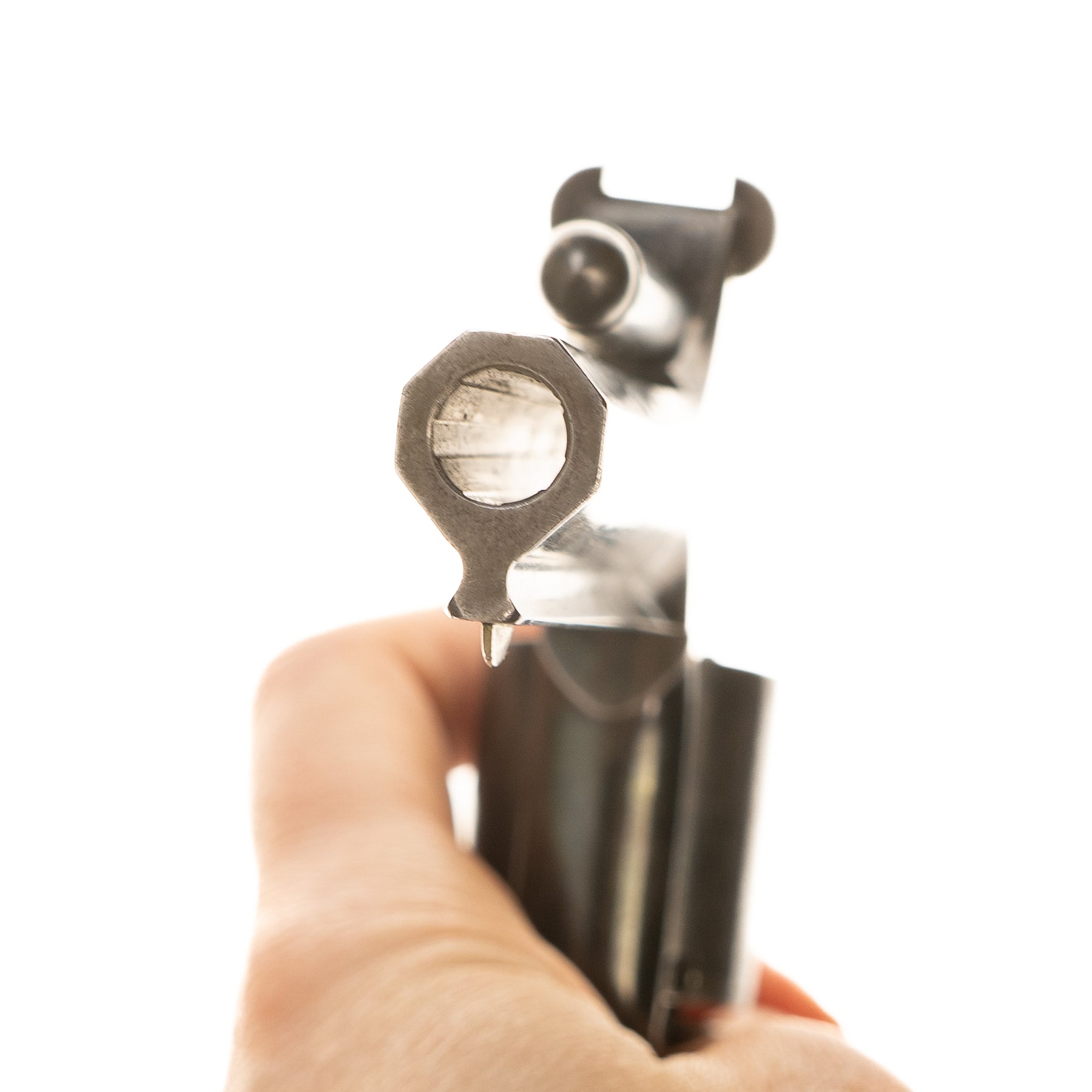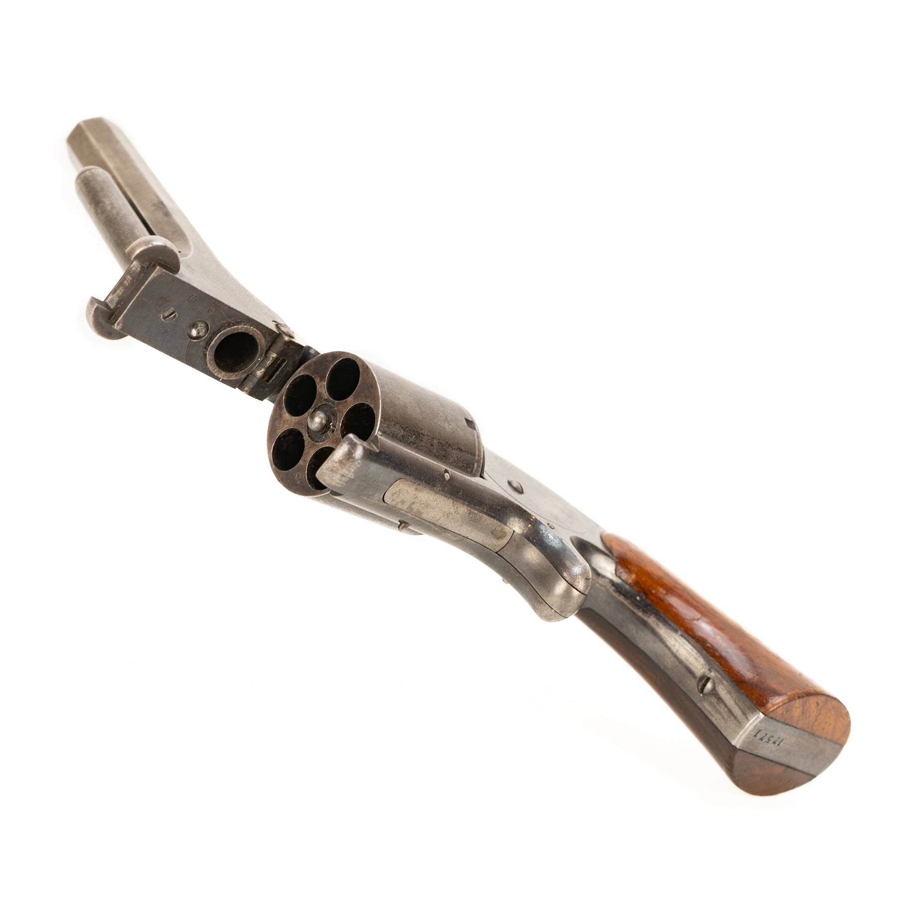 This lovely little tip-up spur trigger revolver has a good bright bore with strong rifling. Lockup is nice and tight and obviously functions in single action only… that little spur trigger isn't gonna move enough to pull back a hammer!