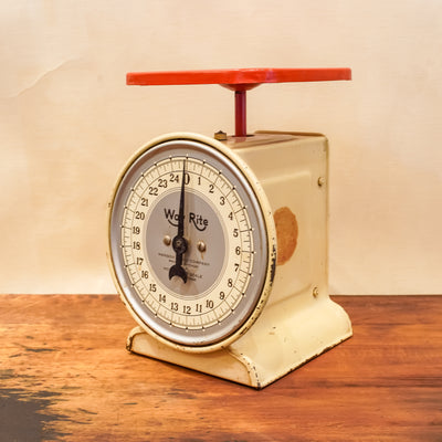 Sweet little Way Rite kitchen scale made by the Hanson Scale Company in Chicago. Weighs up to 25 lbs and adjusts by way of a little screw on the top so you can be sure you're always getting an accurate weight! Pretty much the kitchen personification of an orange creamsicle.