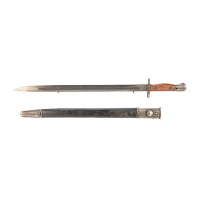 A World War II Australian 1907 pattern bayonet with scabbard, both by Orange Arsenal. Bayonet for the Enfield "SMLE", dated 1945 on the ricasso.